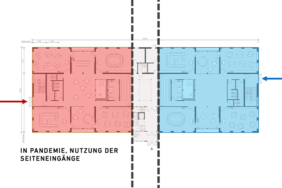 In Pandemie-Zeiten rückt hier vor allem das besonders anpassungsfähige, weil flexible Konzept der Clusterschule in den Fokus. Mit ihr kann ein Gleichgewicht zwischen konzentrierter, isolierter Einzelarbeit und kollektiver Zusammenarbeit geschaffen werden. Ohne grossen Aufwand lassen sich nötige Abstandsregeln umsetzen sowie getrennte Zu- und Ausgänge organisieren.