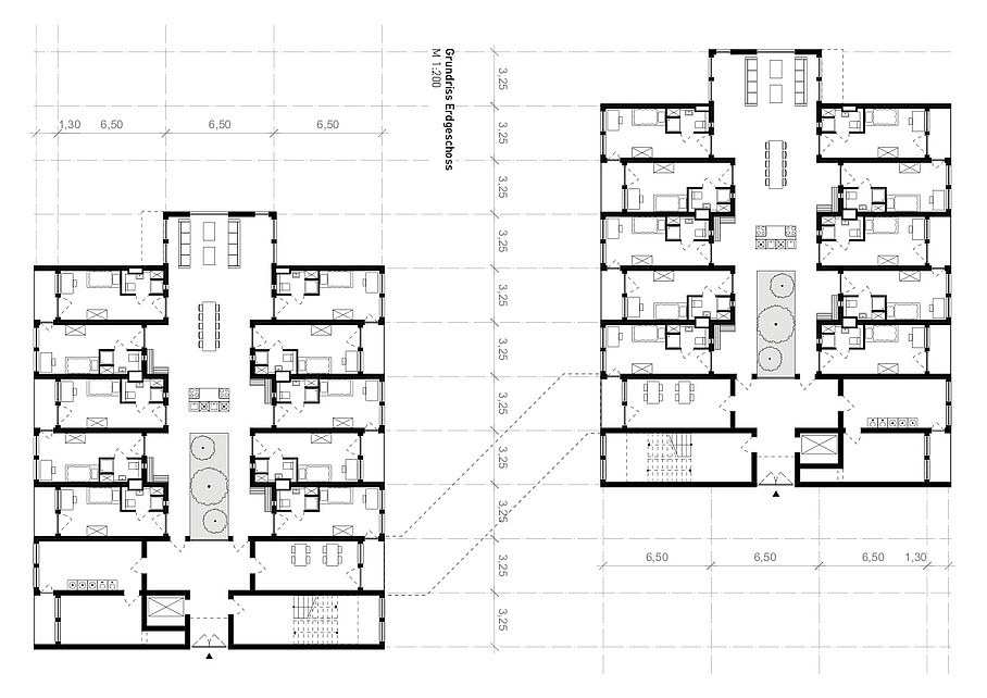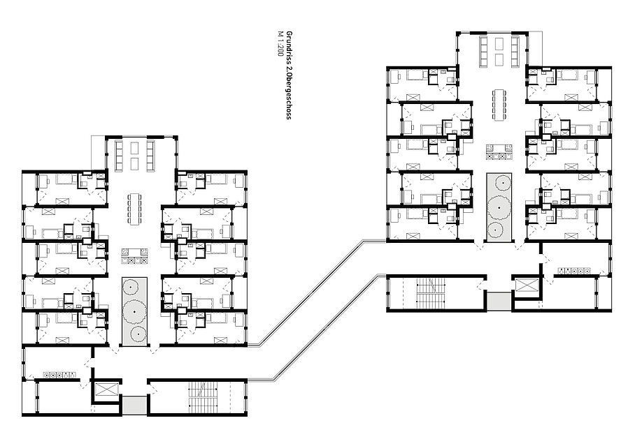 Das Modell des Wohnheims zeigt zwei viergeschossige, würfelförmige Baukörper, die durch eine verglaste Brücke in der zweiten Etage verbunden sind. Der Grundriss basiert konsequent auf einem Modulraster von 3,25 x 6 m, bzw. 3,25 x 12 m. Jede Etage setzt sich aus 15 Modulen zusammen - ein Gebäudekubus besteht somit aus 60 Raumzellen. Die Idee für diesen Grundriss sei direkt aus dem „modularen Baukastensystem“ der Firma ALHO entstanden, berichteten die Studierenden. „Der Modulbau als standardisierte Bauweise bietet letztlich sehr viel Raum für Kreativität“, bestätigt Dipl. Ing. Architekt Michael Lauer, Vertriebsleiter Nord der ALHO Systembau, der den Studierenden persönlich mit fachlichem Rat zur Seite stand. Das vorgefertigte Raster reglementiere und befreie gleichermassen. Da die Module bereits alle bauphysikalischen Anforderungen und Vorgaben an Brandschutz, Wärmeschutz und Schallschutz erfüllen, konnte das Projektteam seinen Fokus auf konzeptionelle und gestalterische Schwerpunkte legen.