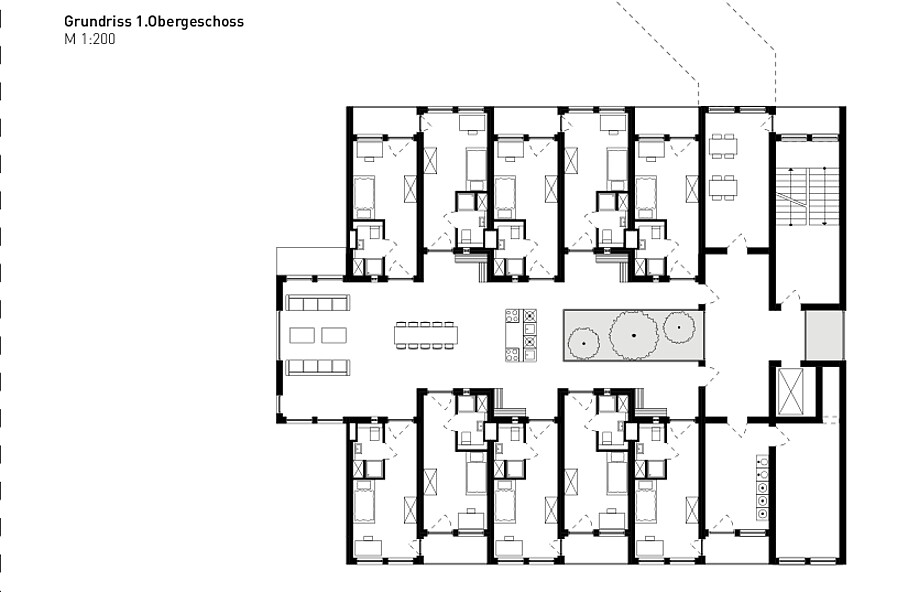 Jede Etage des Modulgebäudes beherbergt eine Wohngemeinschaft mit 10 Personen, insgesamt können also 80 Personen in dem Wohnheim untergebracht werden. Um einen grosszügigen Küchen-, Ess- und Wohnbereich gruppieren sich die jeweils 17 qm grossen Schlafräume – alle mit eigenem Bad. Der Wohnbereich geht in einen auskragenden, mit grossen Fensterflächen versehenen und nach Süden gelegenen Lounge-Bereich über. Am anderen Ende des Gemeinschaftsraums sorgt ein durch alle Stockwerke verlaufender, begrünter Lichtschacht für weiteren Tageslichteinfall, so dass tagsüber keine zusätzlichen Lichtquellen benötigt werden – ein Baustein in Sachen Wirtschaftlichkeit. Komplettiert wird das Raumprogramm durch einen Wasch-Trockenraum und einen Raum zum gemeinschaftlichen Lernen.