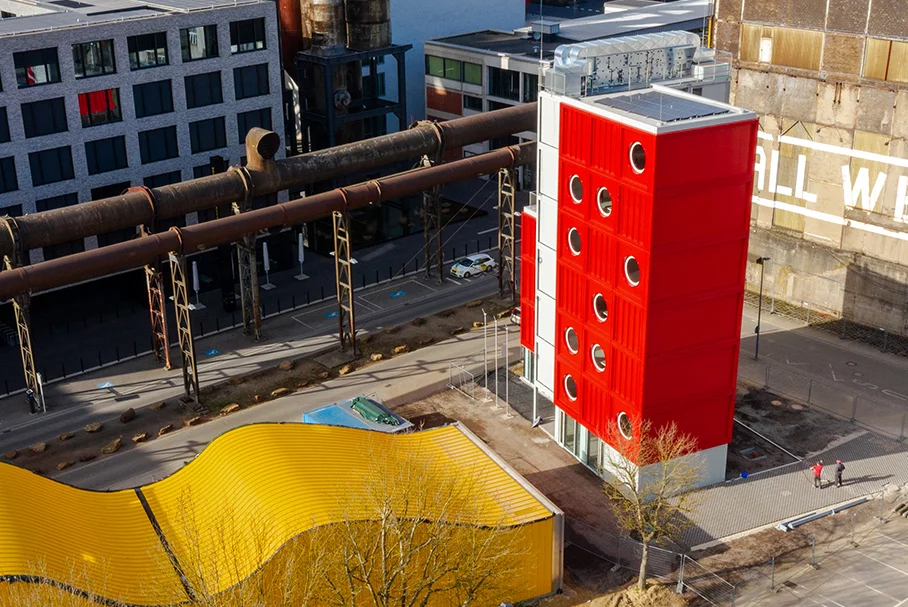 Welche Gebäudelösungen gibt es, die nur für eine begrenzte Zeit benötigt werden, wie beispielsweise für die Organisation der Veranstaltungen im Rahmen der Kulturhauptstadt Esch 2022? Auf diese Frage des Bauherrn hatte ALHO mit seinem Gebäudekonzept exakt die passende Antwort.