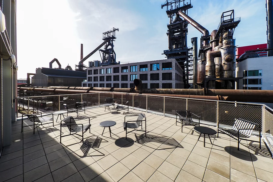 Das Gebäude greift konzeptionell und architektonisch die Tradition der durch die Stahlindustrie geprägten Landschaft auf. Insgesamt 40 Stahlmodule wurden in drei Blöcken zu einem Gebäude zusammengefügt.