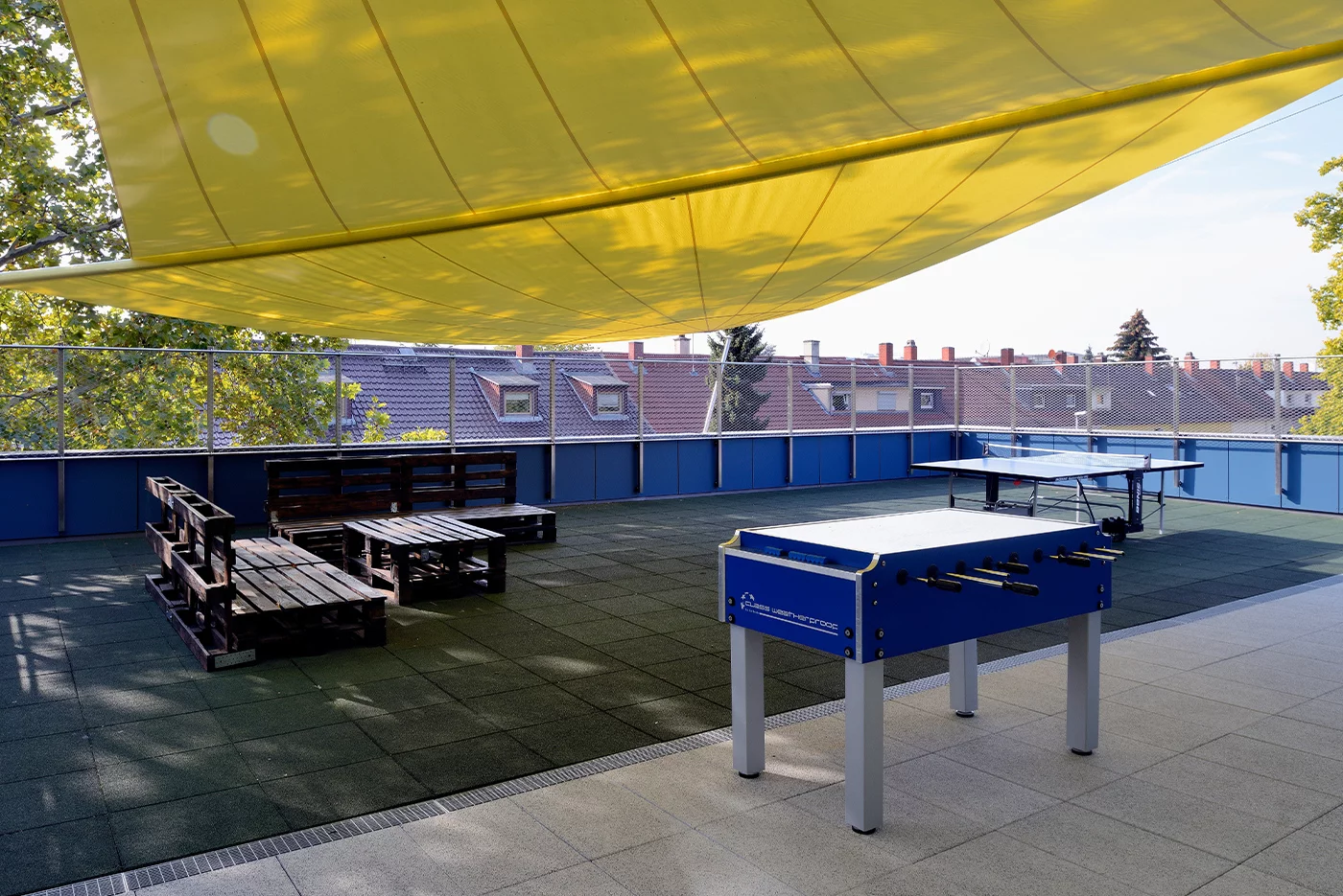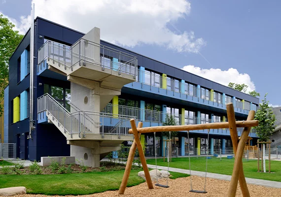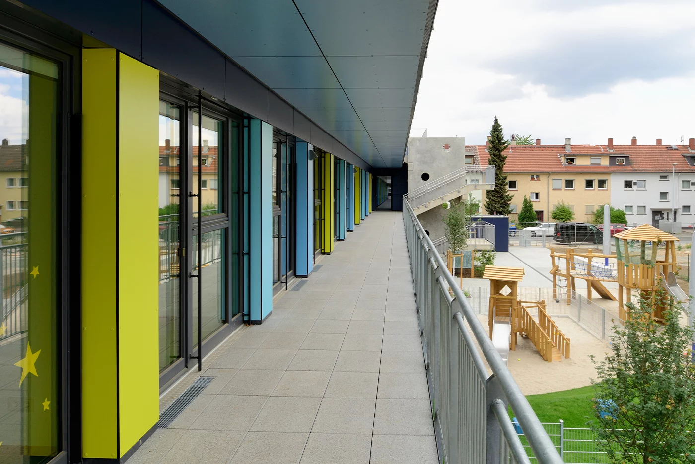 Während vor Ort die Fundamentierungsarbeiten stattfanden, liefen in der ALHO Raumfabrik die 43 Module vom Band. Die Fassade des Gebäudes wird durch eine Trespa-Fassade in unterschiedlichen Blautönen in Kombination mit Holzfenstern und durch die wuchtigen Fluchtbalkone geprägt. Besonderes Highlight für die Kinder ist die großzügige Spielterrasse, die mit einem 55 qm großen Sonnensegel verschattet werden kann.
