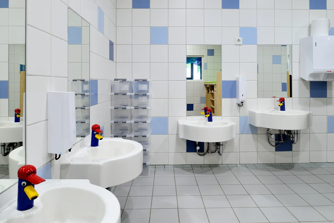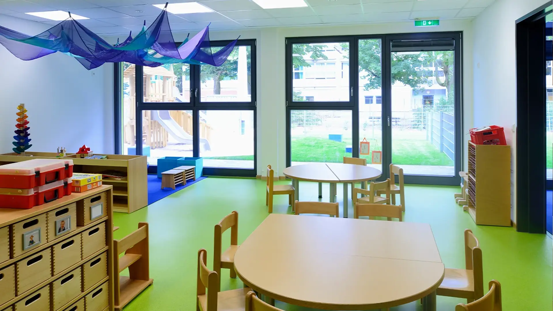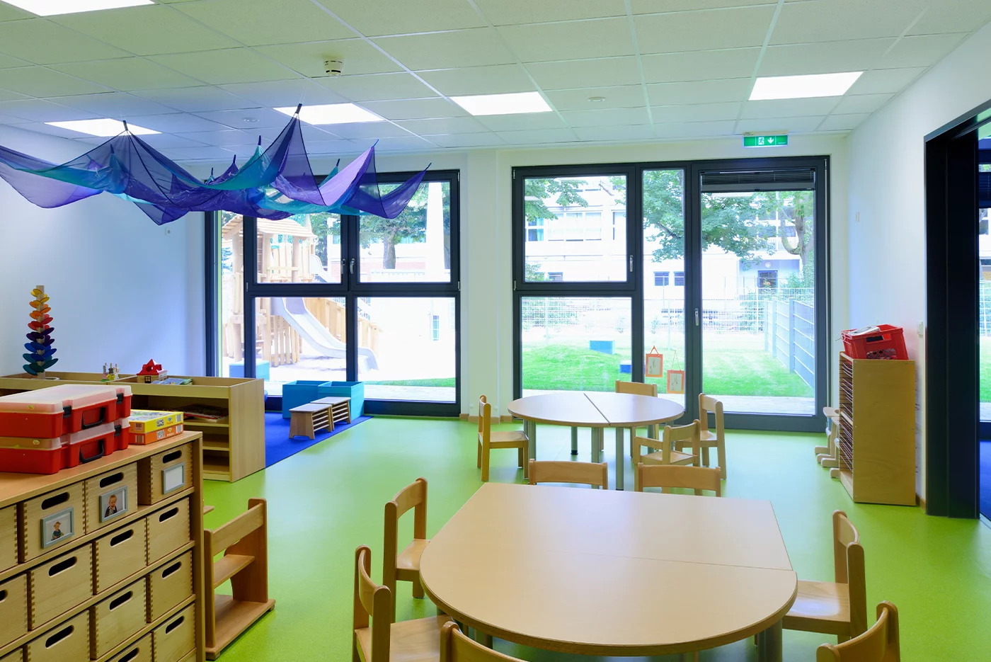 Die Kita bietet Platz für vier Kindergarten- und zwei Hortgruppen. Sie wird durch das Foyer im Erdgeschoss betreten, in welchem ebenfalls zwei Kindergartengruppe mit ihren Gruppen-, Neben- und Schlafräumen sowie Sanitärbereichen untergebracht sind. Über das Foyer gelangt man zudem in das angegliederte Familienzentrum mit großem Mehrzweckraum und Kinderbetreuungsbereich. Ein Büro, Technikräume, Materiallager und ein Kinderwagenabstellraum komplettieren das Raumprogram des Erdgeschosses.