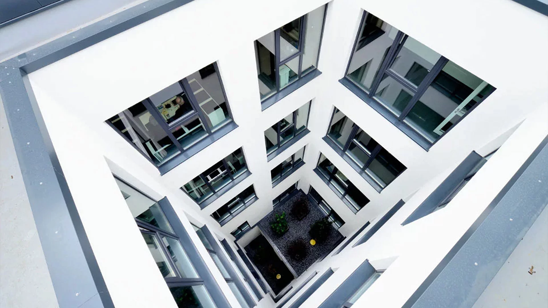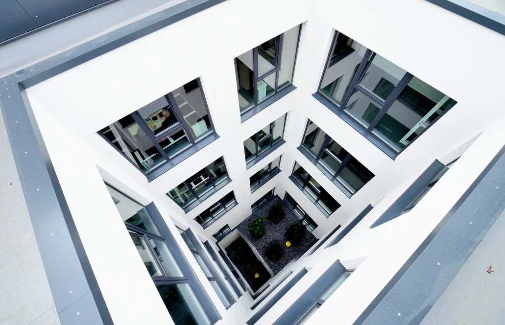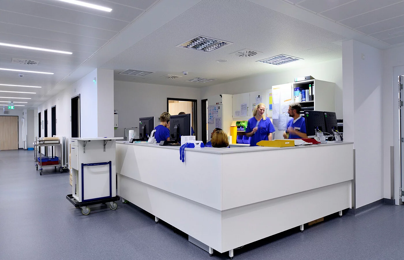Erdgeschoss und erstes Obergeschoss wurden aus Stahlbeton - teils mit Fertigteilen, teils aus Ortbeton - errichtet. Auf diesem „Fundament“ wurden weitere vier Etagen aus ALHO Raummodulen aufgesetzt. Zwischenmodule von 1,16 m Höhe oberhalb des zweiten Obergeschosses schaffen den Höhenangleich für die Anbindung an die Geschosshöhen des Bestands. Den Abschluss des Gebäudes bildet die Technikzentrale als zurückgesetztes Staffelgeschoss auf dem Dach. Aufzugsanlagen an beiden Bestandsübergängen sorgen für eine effiziente Besucher- und Patientenführung auf kurzen Wegen. Die direkte Anbindung einer der Anlagen an die Bettenzentrale vereinfacht die Logistik.