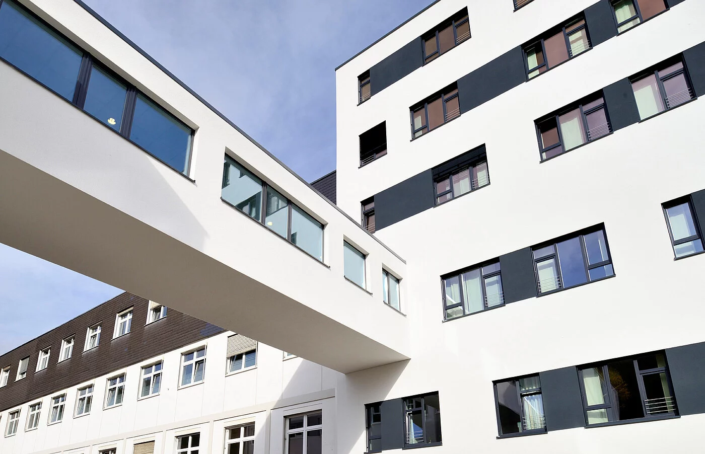 Ohne unsere Erfahrung, als seit über 50 Jahren im Bereich Modulbau führender Anbieter, wäre der Neubau eines Klinikgebäudes dieser Größenordnung in einem Zeitfenster von gerade einmal 16 Monaten nicht möglich gewesen. In Siegen wurde dieser Rekord jedoch geschafft: „Nach Umbau und Erweiterung haben wir nun eines der modernsten Krankenhäuser im weiten Umkreis“, freut sich Bertram Müller, Geschäftsführer der Kreisklinikum Siegen GmbH, über den Umzug des Stadtkrankenhauses an den Klinik-Standort Weidenau. Die Umsiedlung der rund 300 Mitarbeiter und 100 Patienten konnte bei laufendem Krankenhausbetrieb an nur einem Wochenende vollzogen werden. Der L-förmige Neubau wurde an den Stirnseiten über drei Geschosse an die Bestandsgebäude angeschlossen. Eine freitragende, 15 Meter lange Brücke stellt die Verbindung zu einem weiteren Krankenhausbau her.