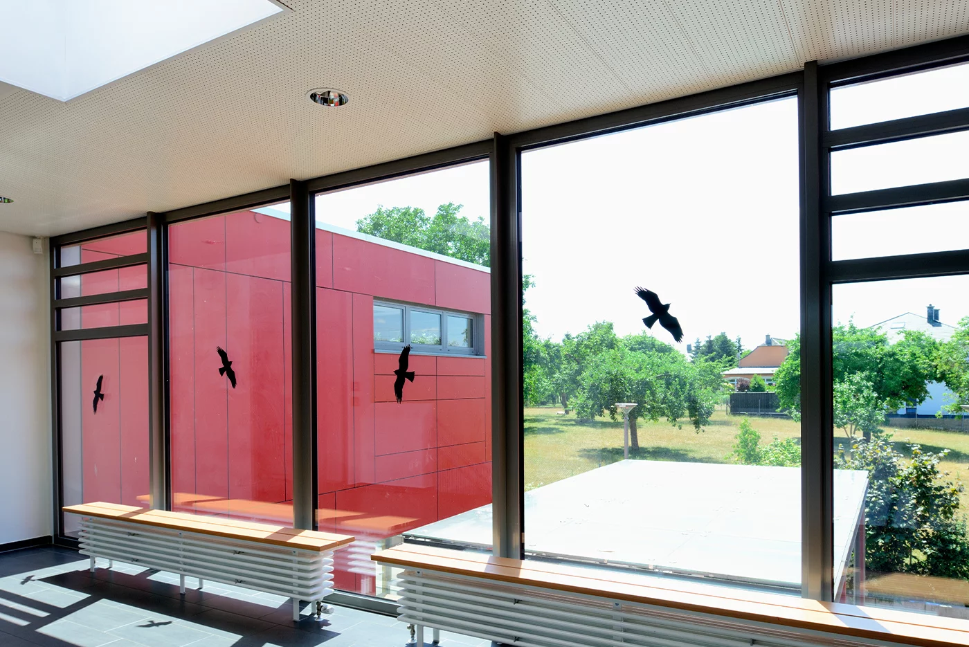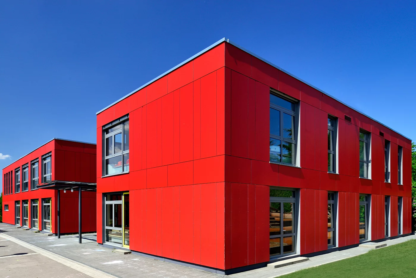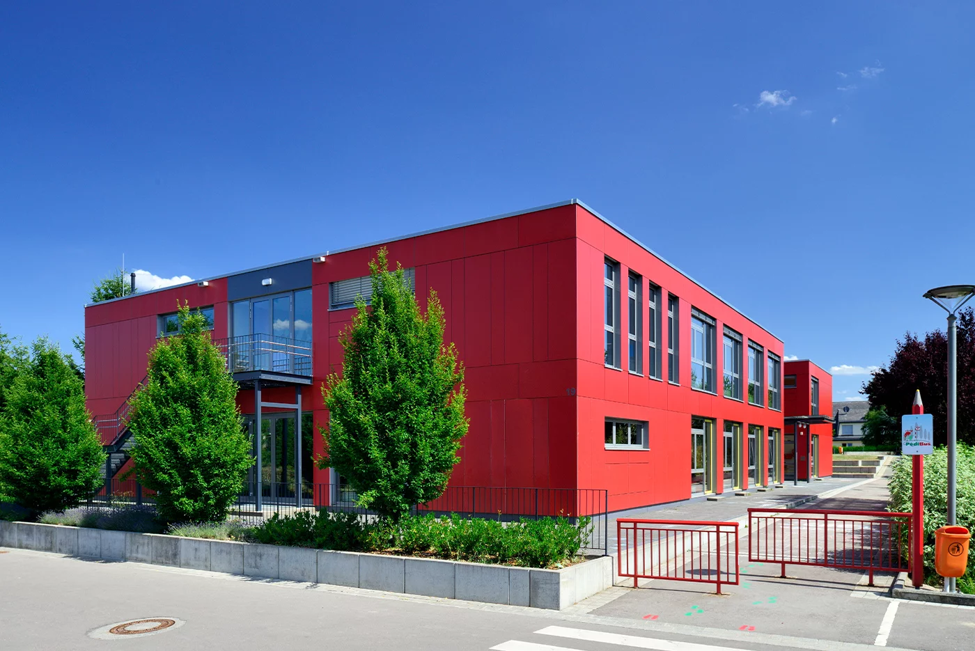 Die feuerroten Faserzementelemente wurden im Anschluss an die Modulmontage als hinterlüftete Fassade aufgebracht und im Obergeschoss um Elemente im gleichen Farbton ergänzt. Das neu ausgebildete Flachdach schließt das Gebäude nach oben hin ab. Eine neue, außenliegende Fluchttreppe und das neue Vordach aus Stahl ergänzen die verglaste Mittelzone und betonen den Eingangsbereich. Mit seiner zweiten Etage sieht das Gebäude heute so aus, als sei es nie anders geplant worden. Die nachträgliche Aufstockung ist als solche nicht zu erkennen und das Haus wirkt perfekt, wie aus einem Guss.