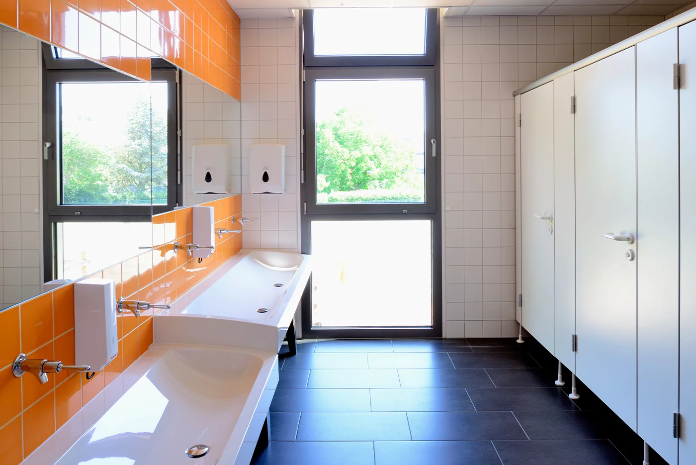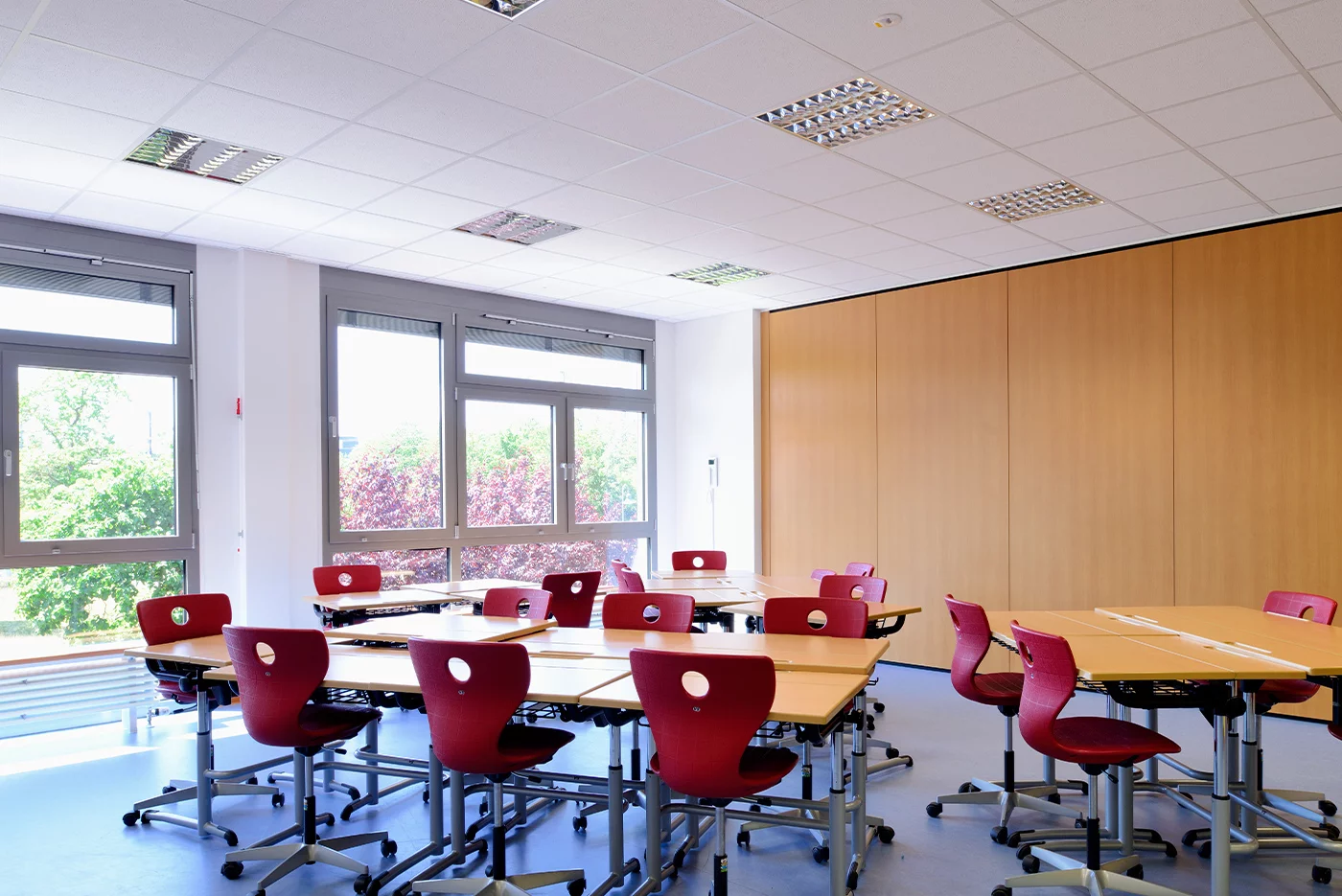 Der Eingangsbereich wurde – den erhöhten statischen Anforderungen zur Erschließung der zweiten Etage mit Aufzug und Betonfertigtreppe entsprechend – statisch aufgerüstet. Er teilt den 780 qm umfassenden Grundriss im Obergeschoss in einen kleineren Trakt mit Werkraum, Mediathek, Aufenthaltsraum und den dazugehörenden Sanitärflächen und einen größeren Lehrbereich mit fünf zusätzlichen Klassenräumen sowie einem Mehrzweckraum mit angegliedertem Abstellraum. Über mobile Trennwände sind jeweils drei Säle koppelbar. Zusammen bieten sie bis zu 190 Quadratmeter stützenfreie Fläche.