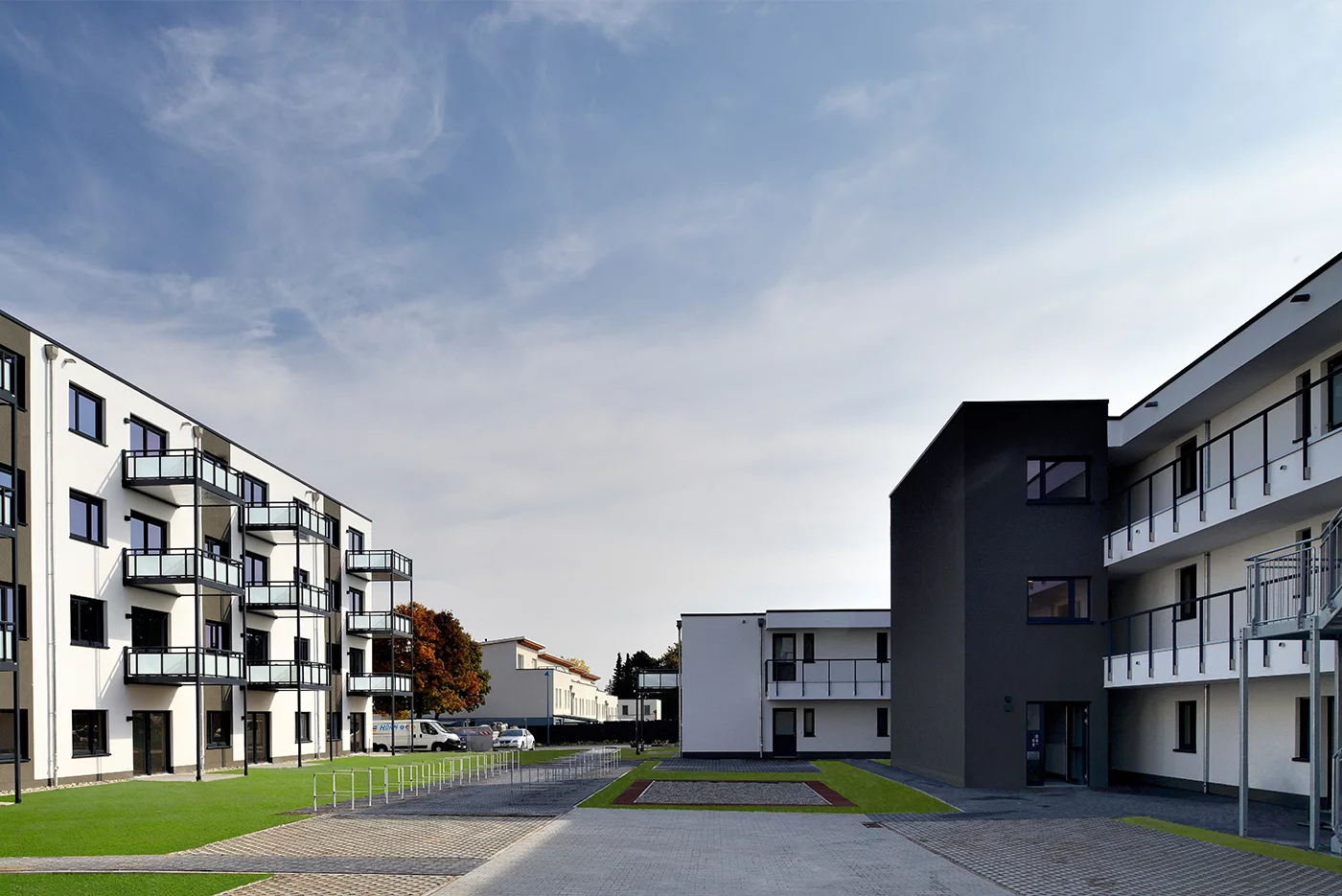 Viele Wohnungsbaugesellschaften besitzen Grundstücke mit Siedlungs-Beständen aus den 1950er und 60er Jahren, die Raum für Nachverdichtung bieten. Das gilt auch für VONOVIA. So entstand eine Wohnanlage auf dem Grundstück Ecke Spiekerooger Straße / Sylter Straße in Wiesbaden. Die zwei-, drei- und viergeschossigen Wohnriegel wurden auf dem annähernd quadratischen innerstädtischen Grundstück in zwei Winkeln entlang des Blockrands positioniert. Sie schließen in ihrer Mitte einen grünen Wohnhof mit Freizeit- und Parkflächen sowie Stellflächen für Fahrräder ein. Insgesamt 38 Wohneinheiten fasst die Gesamtanlage, wobei 16 Wohnungen in einem zwei- bis dreigeschossigen Gebäudeensemble entlang der Sylter Straße und weitere 22 Wohneinheiten in einem drei- bis viergeschossigen Pendant im rückwärtigen Grundstücksteil untergebracht sind.