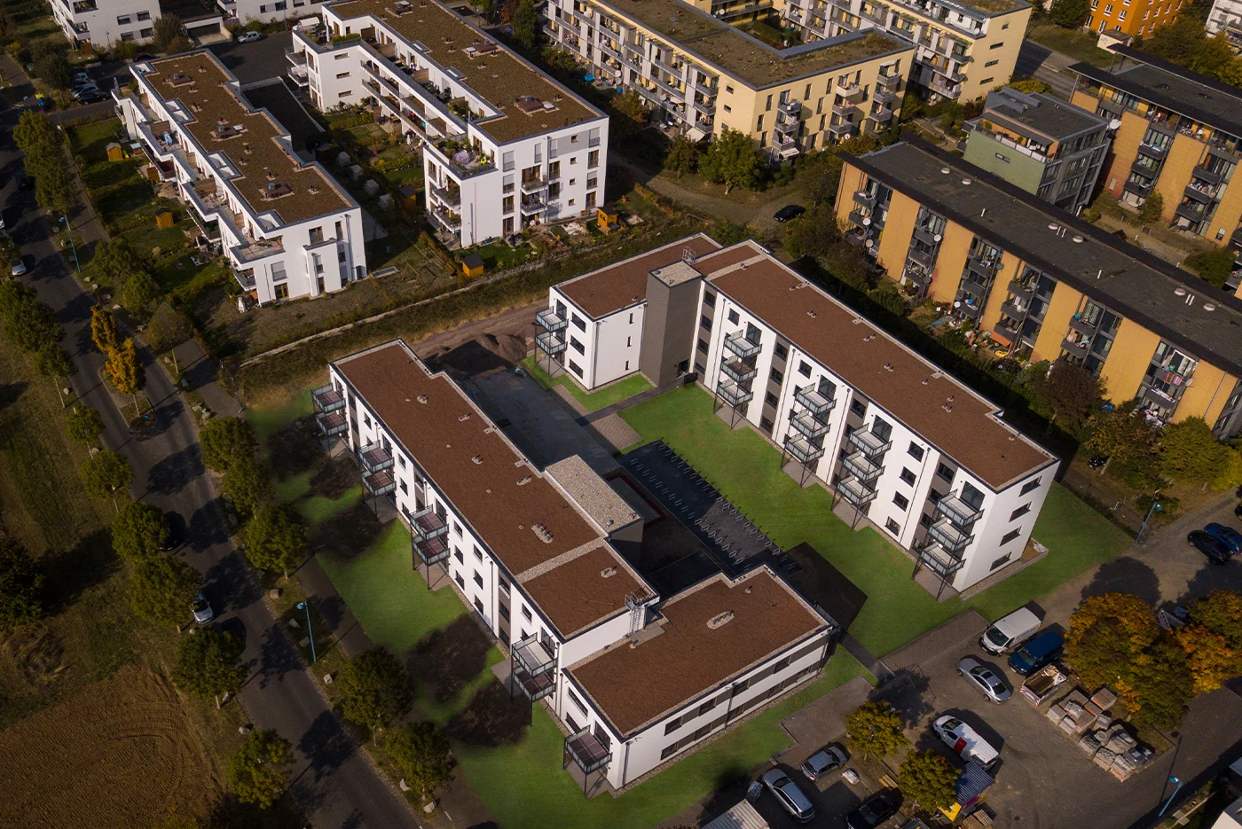 Die Erschließung der Wohnungen ist über Laubengänge und Aufzugstürme organisiert. Die Grundrisse nutzen auf diese Weise das Flächenangebot des Grundstücks optimal aus. Außerdem fungieren die überdachten Laubengänge als gemeinschaftlich genutzte Vorzonen, die als lebendige Wohnstraßen die privaten Wohnungszugänge zu informellen Treffpunkten und sozialen Kontaktflächen erweitern. Durch die unterschiedliche Geschosszahl der Gebäude in offener Winkelanordnung um einen grünen Wohnhof herum entsteht ein städtebaulich ansprechendes Gesamtbild der Anlage, die sich gut in die gewachsene Struktur der Nachbarschaftsbebauung einfügt.