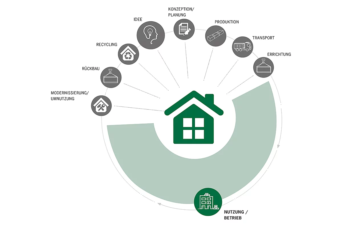 Knapp die Hälfte der Energiebilanz eines Gebäudes in seinem Lebenszyklus entfällt auf diese „unsichtbare“ graue Energie. Denn neben der Nutzung und dem Betrieb eines Gebäudes sorgen die folgenden Prozessschritte für eine negative Energielast mit nicht unerheblichem Treibhauspotenzial: