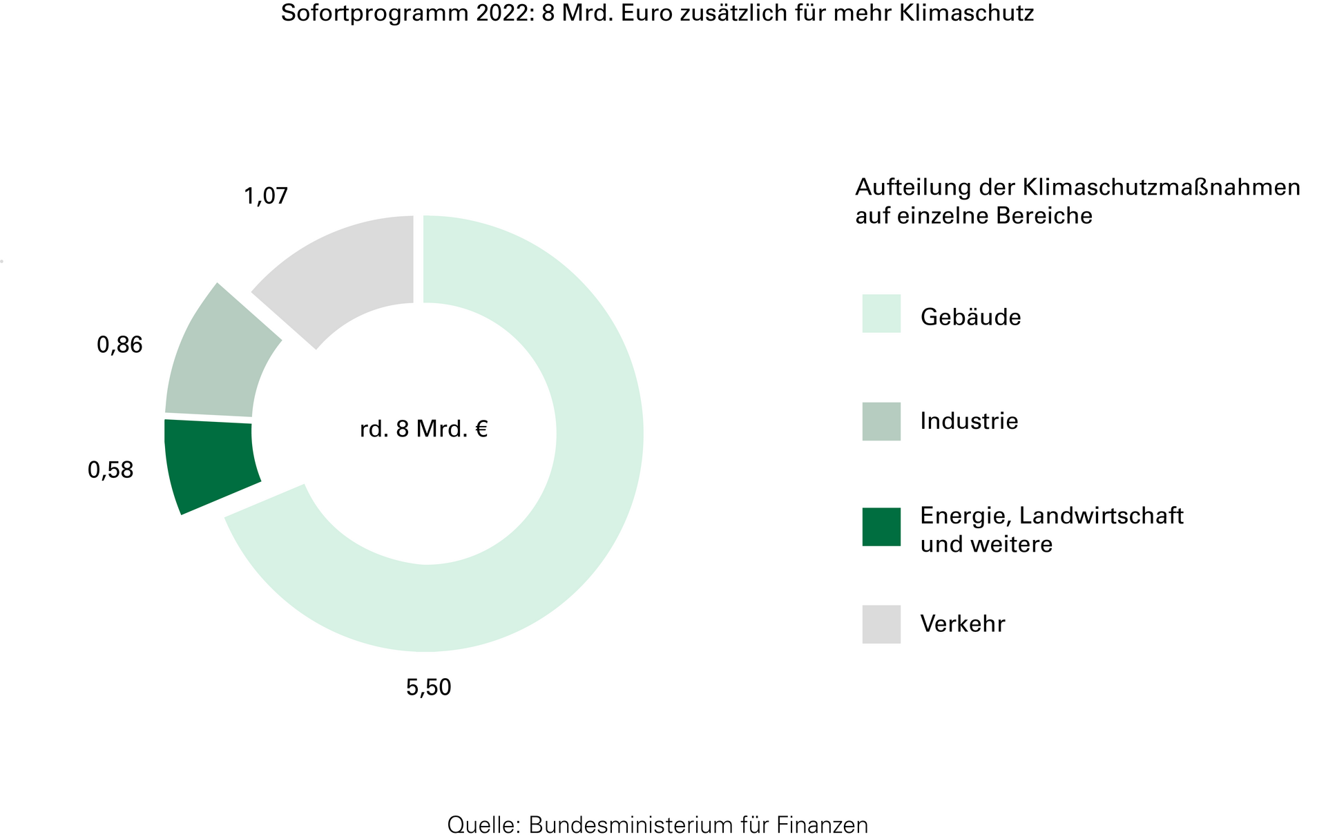 Für die Förderung der energetischen Sanierung von Wohngebäuden und den klimafreundlichen Neubau oder die Sanierung von Sozialwohnungen hat die Bundesregierung bis 2025 zusätzliche 5,5 Milliarden Euro bereitgestellt. Gleichzeitig sollen die energetischen Mindeststandards für neue Gebäude angehoben werden.
