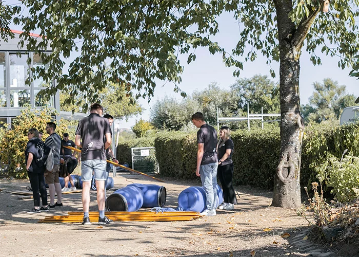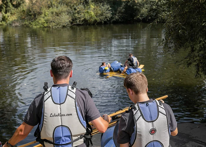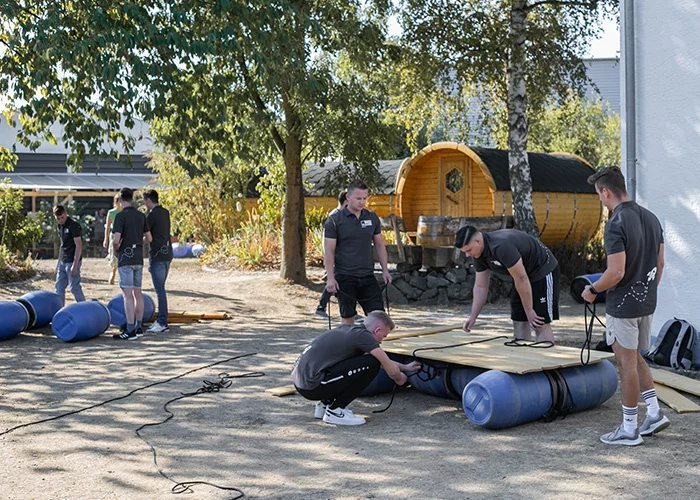 Morgens startete die Gruppe mit dem Bus in Lichtenberg, noch wussten die Azubis nicht, wohin die Reise geht. Nach 1,5 Stunden Fahrt angekommen, ahnten die ersten langsam, was der Tag mit sich bringen würde. Das Ziel war die Kanustation in Wetzlar, allerdings sah das Tagesprogramm nicht ganz so einfach aus. Für unsere Azubis hieß es nun: „Ihr erleidet Schiffbruch auf offenem Meer und seid auf einer verlassenen Insel gestrandet.“ Lediglich ein paar Bretter, Seile und Tonnen hatten sie zur Verfügung, um sich aus dieser Situation zu retten.