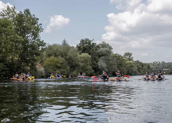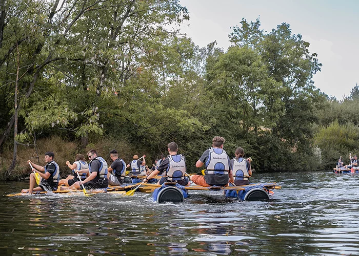In Gruppen machten sie sich nun daran, ihr Floß zu bauen – und hatten dabei ganz unterschiedliche Ansätze. Nach einer gemeinsamen Mittagspause mit kleiner Stärkung folgte der spannende Teil des Tages: der Praxistest beim Floßwettrennen! Alle hatten sichtlich Spaß und auch wenn das ein oder andere Floß es leider nicht ins Ziel geschafft hat, die Abkühlung kam bei dem Wetter gelegen.