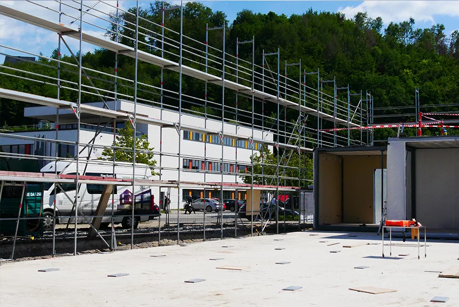Drei Wochen nach Montagebeginn der Raummodule für die Erweiterung der Akademie Gesundheitswirtschaft und Senioren (AGewiS) auf dem Steinmüllergelände in Gummersbach steht der veredelte Rohbau.