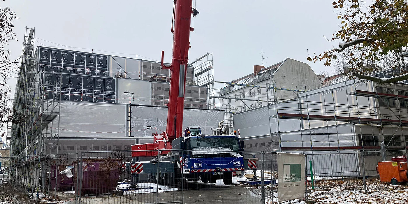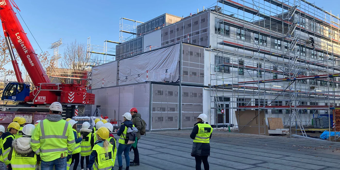 Zum Ende des dritten Bauabschnitts haben uns einige Schülerinnen und Schüler mit ihren Lehrkräften einen Besuch auf der Baustelle abgestattet und das wachsende Gebäude bestaunt. Langsam, aber sicher neigt sich die Montage dem Ende zu und die vier Geschosse vervollständigen sich. Noch braucht es für die Kleinen einiges an Vorstellungskraft, in einigen Wochen – mit Voranschreiten des Innenausbaus – werden die Unterrichtsräume allerdings schnell Gestalt annehmen. Einige Tage später war statt strahlend blauem Himmel der erste Winter eingebrochen – dank der hohen Vorfertigung der Module konnten wir uns aber über die ersten Flocken freuen und die Montage fortsetzen.