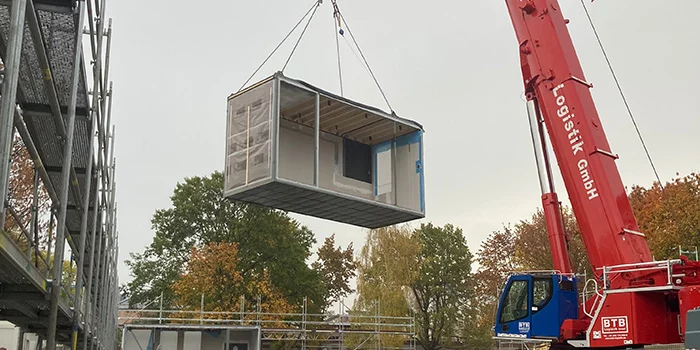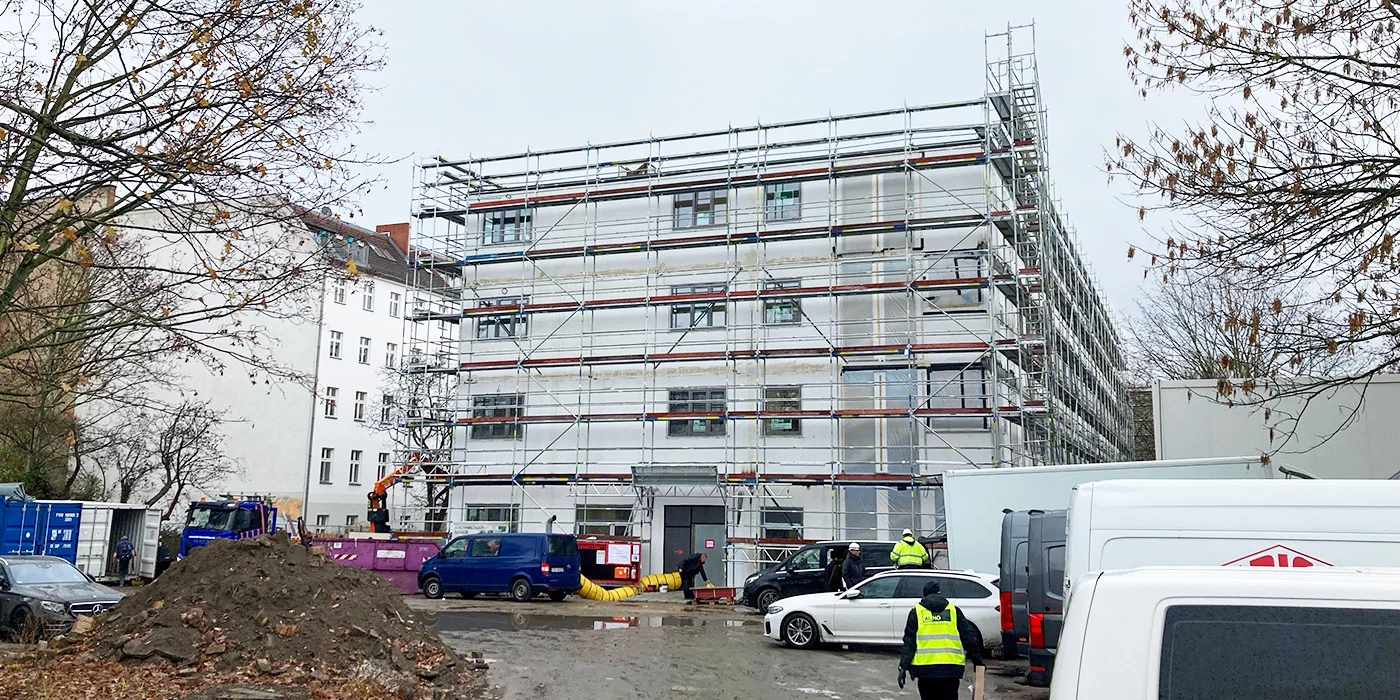 Die Bodenplatte ist ausgehärtet und letzte Vorbereitungen werden getroffen. In der Nacht hat sich bereits ein Schwertransport auf den Weg von Friesenhagen nach Pankow gemacht, der in den frühen Morgenstunden auf der Baustelle eintrifft. Bis dahin wird das Gerüst aufgebaut, bevor der Kran Modul Nummer 1 an seinen Platz hebt. Nun folgen noch 203 weitere Module, parallel beginnt bereits langsam der Innenausbau.