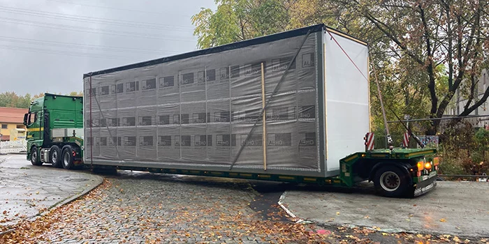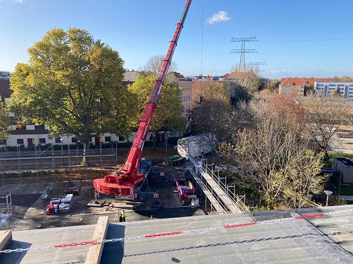 Donnerstagmorgen brach der finale Montagetag an – die letzten Module trafen auf der Baustelle ein und konnten im Laufe des Tages montiert werden. Mit einer Montagedauer von knapp 7 Wochen haben mittlerweile alle 204 Raummodule den Weg nach Pankow gefunden und ihren Platz eingenommen. Nun stehen 6.200 m² veredelten Rohbaus, die auf ihren Innenausbau warten. Noch vor einer kurzen Weihnachtspause beginnen die Außengewerke mit Abdichtungsarbeiten, Dach- und Fassadenarbeiten. Der Innenausbau, der parallel zur Montage gestartet war, ist bereits in vollem Gange und kann direkt im neuen Jahr weiter Fahrt aufnehmen.