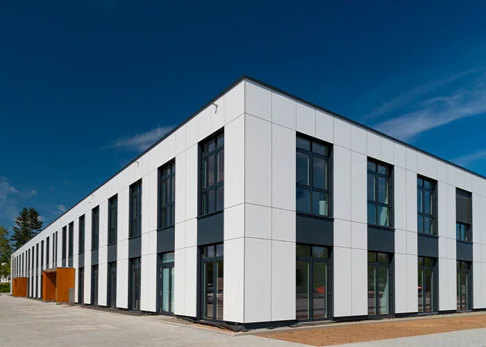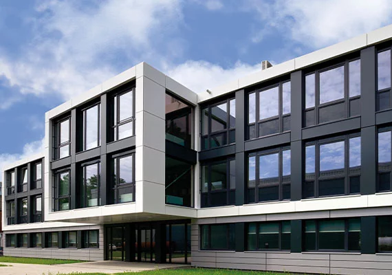 Für eine neugegründete Projektgruppe des Geschäftsbereichs Siemens Mobility der Siemens AG am Standort Braunschweig mussten schnellstens optimale Arbeitsbedingungen in einem neuen Bürogebäude auf dem Gelände geschaffen werden. Joachim Döring, Immobilienveranwortlicher bei der Siemens Mobility GmbH, erläutert: „Der Neubau, der direkt am Eingang zum Betriebsgelände positioniert ist, sollte einerseits zum bestehenden Gebäudeensemble passen, aber auch über eine entsprechend repräsentative Außenwirkung verfügen, um die Siemens Corporate Identity angemessen zu unterstützen.“ Die hoch wärmegedämmte, hinterlüftete Vorhangfassade aus weißen Hochdrucklaminat-Platten gibt dem Gebäude einen technischen, geradlinigen Look. Liegende, anthrazitgraue Fensterbänder, eingerahmt von weißen Fassadenelementen und die schwarz hinterlegten Horizontalfugen im Fassadenbild unterstreichen die dynamische Gebäudeform. So ist das Gebäude eine perfekte Referenz für inzwischen 170 Jahre Ingenieurskunst und Innovation, für die Siemens bekannt und berühmt ist.