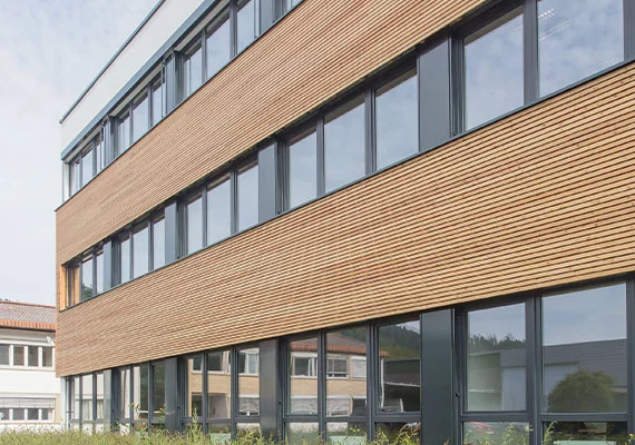 Während Unternehmer ihren persönlichen Vorstellungen baulichen Ausdruck verleihen, unterliegt die Architektur von Konzerngebäuden oft strikten Vorgaben. Auch diese lassen sich in Modulbauweise umsetzen – wie beispielsweise bei den Büro- und Laborgebäuden der F. Hoffmann-La Roche AG in Kaiseraugst. Die vorgehängten hinterlüfteten Fassaden sind mit gedämmten Aluminiumpaneelen verkleidet. Das einheitliche Weiß der pulverlackbeschichteten Elemente wurde in Glanzgrad und Farbton von einem Farbdesigner festgelegt und ist als typisches „Roche-Weiß“ überall am Standort zu identifizieren. So passten sich auch das in Modulbauweise realisierte Gebäude B228 und das Roche Learning Center gestalterisch in die bereits etablierte, zurückhaltende und zeitlose Architektursprache der Roche-Gebäude an.