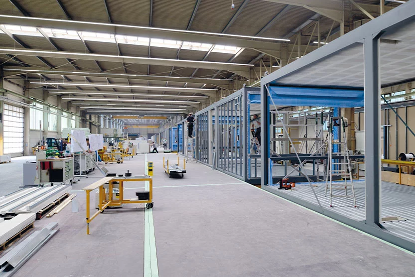 Nun zum Ausführungsprozess: Im Vergleich zum konventionellen Bauen wird unser Produkt witterungsunabhängig in einer Halle gefertigt. Betrachten Sie einmal die normalen Baustellenbedingungen im konventionellen Bau: Kälte, Regen, Schnee, zunehmend zu starke Sonneneinstrahlung bzw. zu hohe Temperaturen für den korrekten Einbau von Beton – alle diese Themen kennen wir bei der Modulbauweise nicht. In unseren beheizten Produktionshallen herrschen das ganze Jahr über die Umgebungstemperaturen, welche die von uns verwendeten Baumaterialen für die optimale Verarbeitung benötigen. Zudem sind die Arbeitsbedingungen für unsere Mitarbeiter optimiert. Mir persönlich ist ein weiterer Punkt aufgefallen: Es gibt am Bau bekanntlich Toleranzen, diese bewegen sich im Massivbau im Zentimeterbereich. Wir denken in unserer Produktion in Millimetern. Ich finde, dies sagt auch schon viel aus.