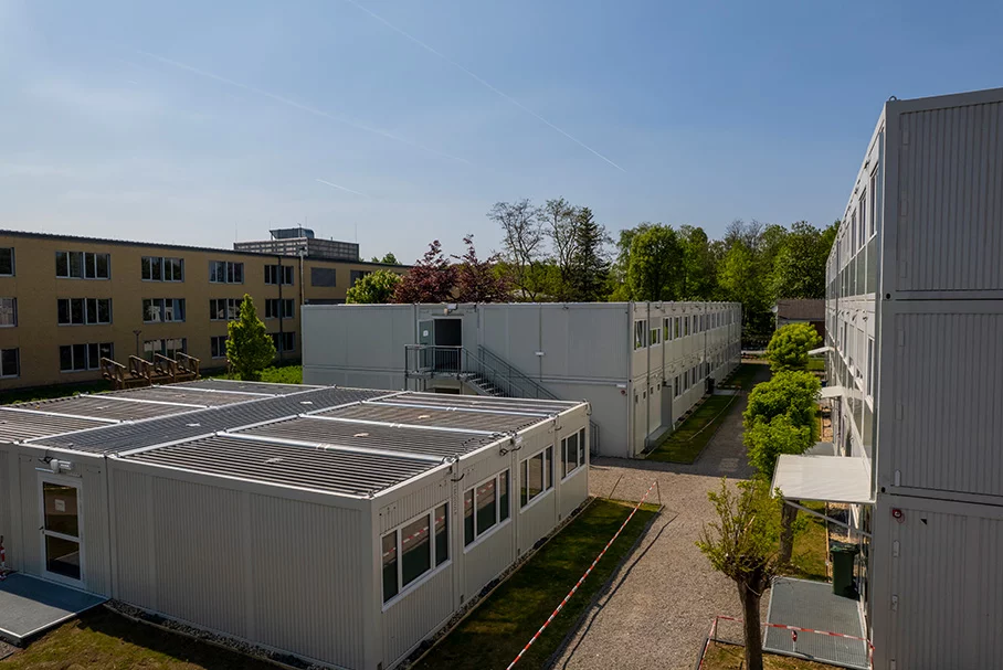 Die 3.000 qm große Interims-Schulanlage, bestehend aus 183-Mietcontainern wurde Anfang 2022 fertiggestellt.