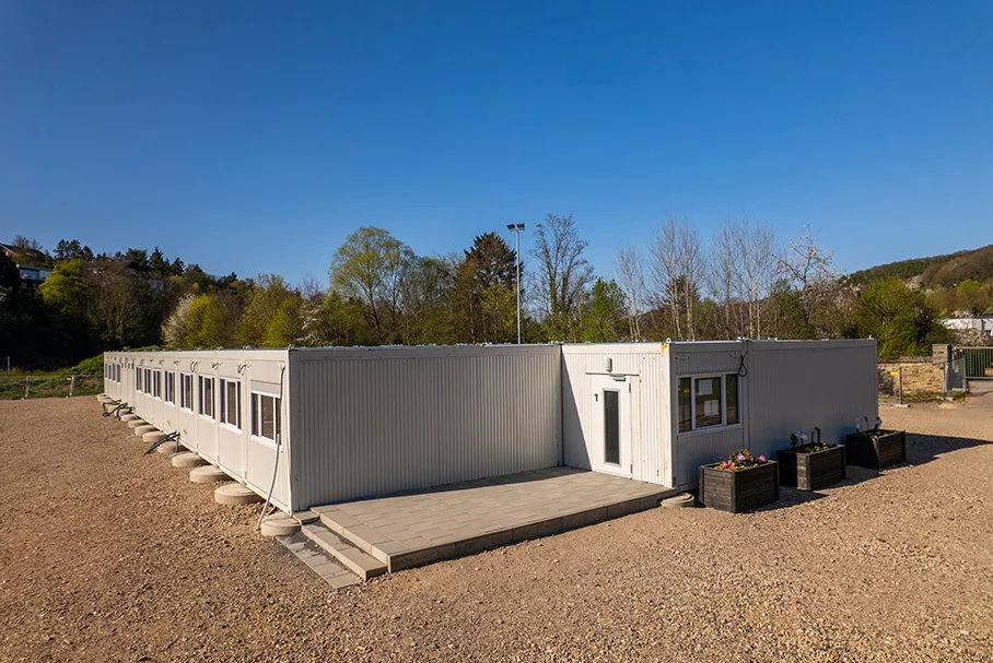 Auch die integrative Realschule in Sinzig musste nach der Flut saniert werden. FAGSI schuf in nur vier Wochen ein zweigeschossiges Ausweichgebäude aus 39 Containern.