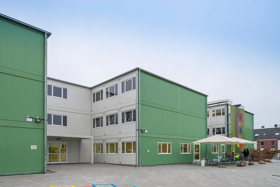 Man wusste es schon vor Corona, doch im Pandemiejahr 2020 wurde es besonders deutlich: Viele Schulen in Deutschland sind die Jahre gekommen und müssen dringend für zeitgemäße Bildungsanforderungen fit gemacht werden. Digitales Lernen und individuellere pädagogische Konzepte fordern flexible Architektur. Auch die Tendenz zu mehr Ganztagesbetreuung stellt Planer vor anspruchsvolle Aufgaben, denn Schulen wandeln sich immer von reinen Lernorte immer mehr zu Lebensräumen, die ein stückweit das Zuhause ersetzen müssen und zu Orten werden, wo sich Schülerinnen und Schüler ebenso wohlfühlen sollen, wie Lehrerinnen und Lehrer. Ob „Zwergschule“ im ländlichen Kontext oder großer Gymnasialkomplex in der Stadt: Es werden Gebäude benötigt, die mit flexibel ausbaubaren, erweiter- und zugleich abtrennbaren Raumstrukturen auf ganz unterschiedliche Anforderungen reagieren können. Um diesem Ziel näher zu kommen, sind während Sanierung, Erweiterung und Neubau temporäre Schulen aus Containern die ideale Lösung.