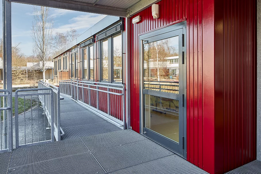 Mit dem neuen Bildungscampus, der derzeit im Kölner Stadtteil Kalk entsteht, ergänzt das Erzbistum Köln sein bereits bestehendes Engagement im Bildungsbereich um einen weiteren wichtigen Baustein: Die neue Grund- und Gesamtschule soll Kinder und Jugendliche aus allen Gesellschaftsschichten vom Kindergarten bis in den Beruf begleiten und ihnen individuelle Chancen für die Zukunft eröffnen. 2024 ist die Fertigstellung des Gebäudekomplexes an der Christian-Sünner-Str./Ecke Dillenburger Straße geplant. Damit die Grundschule aber schon 2020 an den Start gehen konnte, errichtete das Erzbistum Köln ein FAGSI Interimsgebäude gleich um die Ecke an der Neuerburgstraße. Mit seiner hochwertigen, anthrazitgrauen Glattblechfassade und den umlaufenden Wegen, Terrassen und Außenplattformen verzahnt sich der eingeschossige Flachdach-Baukörper mit den umgebenden Grünflächen zu einer harmonischen Einheit.