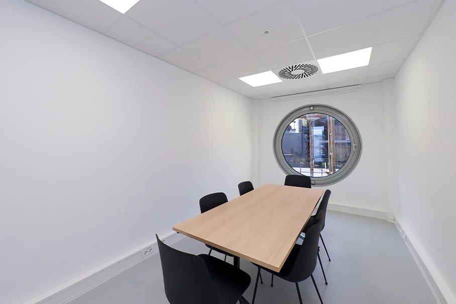 Ein großer Konferenzraum mit angeschlossenem Sanitärbereich bildet das Erdgeschoss. Auf den Ebenen zwei bis vier, sechs und sieben befinden sich Großraumbüros mit jeweils sechs Arbeitsplätzen. Ein Aufenthaltsraum für das Team mit Küchenzeile wurde im fünften Obergeschoss untergebracht.