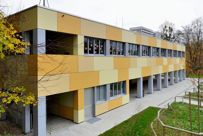 Nach skandinavischem Vorbild basiert das Münchener Lernhauskonzept auf dem Streben, die Unpersönlichkeit großer Schulen aufzulösen, damit ein besonderes Miteinander entsteht. Im Lernhaus lernen Schüler aller Jahrgangsstufen in räumlichen und organisatorischen Clustern. Mehrere Klassen bilden im Lernhaus eine kleine Schule in der Schule – mit Lern-, Unterrichts- und Ruheräumen, aber auch mit eigenen Garderoben, Toiletten und einer Lehrerstation. Die Räume eines Lernhauses gruppieren sich um eine Mitte: ein Forum, das im Laufe des Tages flexibel genutzt wird. Ade „Flurschule“ – hallo zur pädagogisch nutzbaren, barrierefreien Fläche mit Foren, Differenzierungs- und Inklusionsräumen. Ein Beispiel dafür ist der Schulpavillon Berner Straße, den ALHO für die Landeshauptstadt München nach Plänen des Architekten Alexander Stecher realisierte.