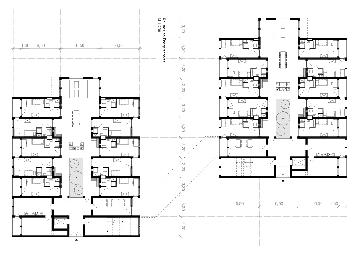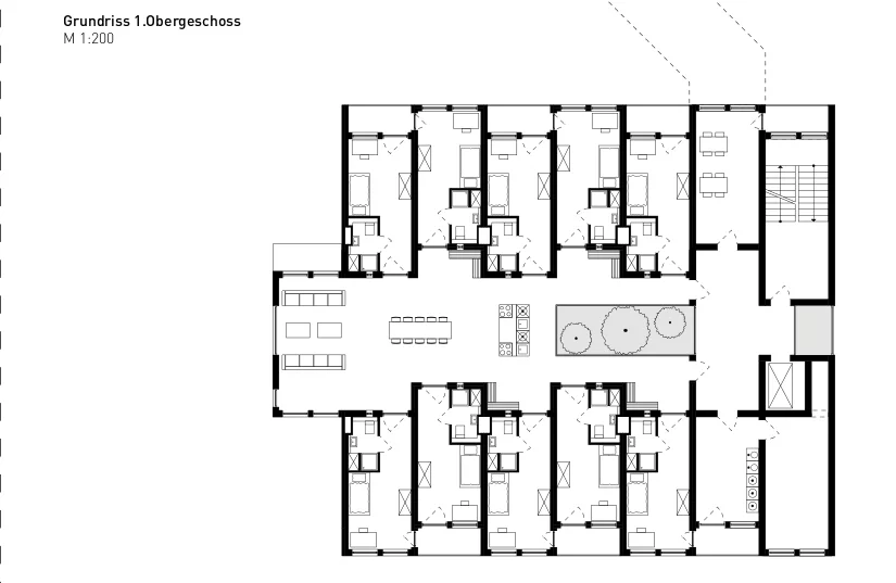 Am anderen Ende des Gemeinschaftsraums sorgt ein durch alle Stockwerke verlaufender, begrünter Lichtschacht für weiteren Tageslichteinfall, so dass tagsüber keine zusätzlichen Lichtquellen benötigt werden – ein Baustein in Sachen Wirtschaftlichkeit. Komplettiert wird das Raumprogramm durch einen Wasch-Trockenraum und einen Raum zum gemeinschaftlichen Lernen.