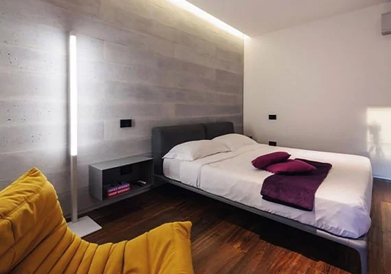 Die Privaträume sind je Geschoss unterschiedlich leicht versetzt angeordnet und schaffen so außen Raum für Loggien und innen Staufläche und Nischen für Schränke. Das Wechselspiel der querformatigen Öffnungen der Loggien und der hochformatigen, bodentiefen Fenster schafft eine spannungsvolle Fassade. Diese wird noch dazu durch die verwendeten Materialien verstärkt: Die Fassadenverkleidung besteht aus Cortenstahl - einem gewollt selbstrostenden Material, das sich häufig auf dem ehemaligen Steinmüller-Gelände, auf dem die FH angesiedelt ist, wiederfindet und das an die Industrie-Vergangenheit des Areals erinnert. Eine pulsierende LED-Lichtinstallation unterbricht die unregelmäßig geformten und angeordneten Stahlelemente und verleiht der Fassade mit dieser Lichtchoreografie einen „eigenen Herzschlag“ zu später Abendstunde. Im Kontrast dazu stehen begrünte Wandflächen des Erkers, die einen Naturbezug schaffen und für ein angenehmes Wohnklima sorgen.