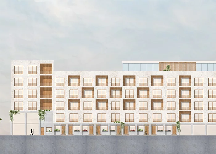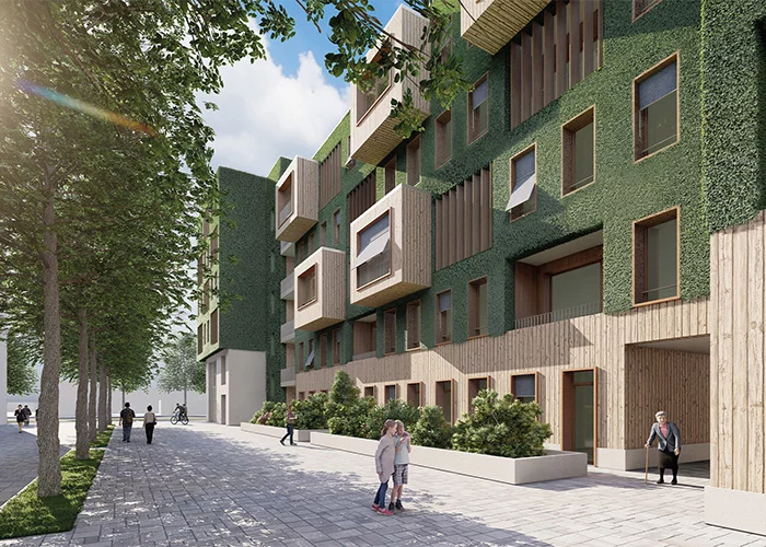 Entscheidendes Merkmal dieses ganzheitlich gedachten Entwurfs mit Laubengangerschließung sind die sogenannten „Nachbarschaften“. Sie strukturieren die große Baumasse in kleinere Zonen und fördern Orientierung, Begegnungen und soziale Interaktion. Die intelligente Positionierung der einzelnen Module ermöglicht eine sinnhafte Anordnung diverser Wohnungstypen, welche die soziale Durchmischung und Urbanität stärken.