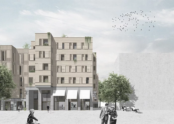 Der Entwurf lässt eine tiefgehende Beschäftigung mit typologischen und konstruktiven Fragestellungen im Rahmen der Entwurfsaufgabe erkennen und führt diese in einem ganzheitlichen Konzept zusammen. Das im Sinne der Urbanität funktional stark durchmischte Erdgeschoss agiert dabei als massiv ausgeführter, konstruktiver „Tisch“ für die darüber liegenden, modular aufgebauten Wohngeschosse. Innerhalb einer sinnhaften und ausgeklügelten Struktur aus gleich breiten und unterschiedlich langen Raummodulen wird insgesamt ein vielfältiger Wohnungsmix angeboten. Die Ausnahme bildet das sogenannte „Green House“, welches mit seiner Orientierung zum Quartiersplatz auf allen Ebenen öffentliche und halböffentliche Nutzungen aufnimmt.