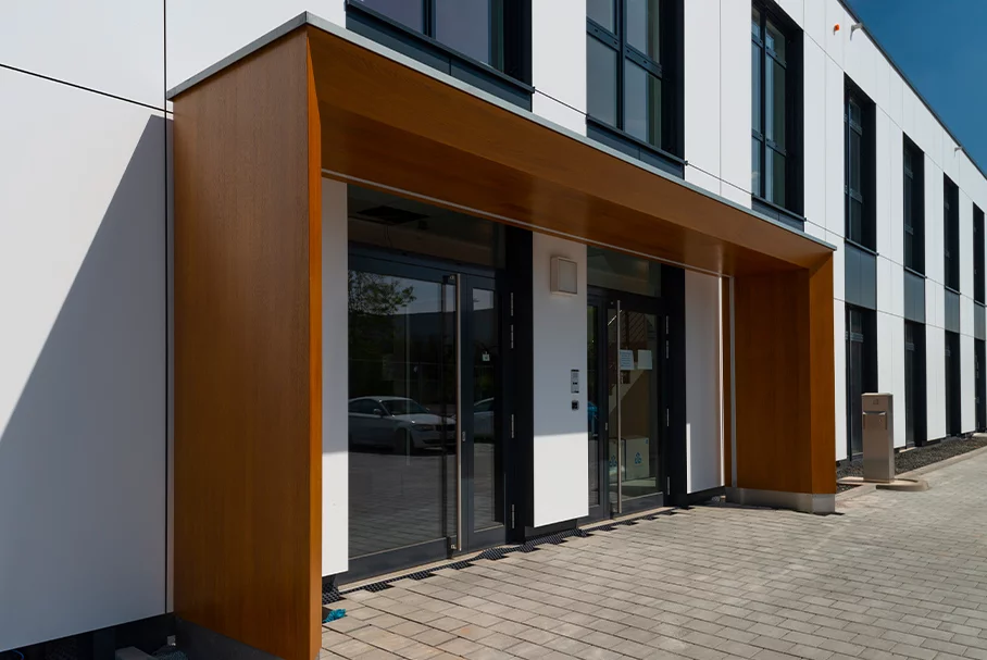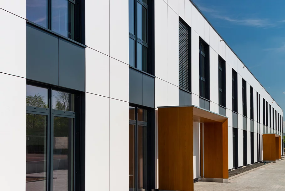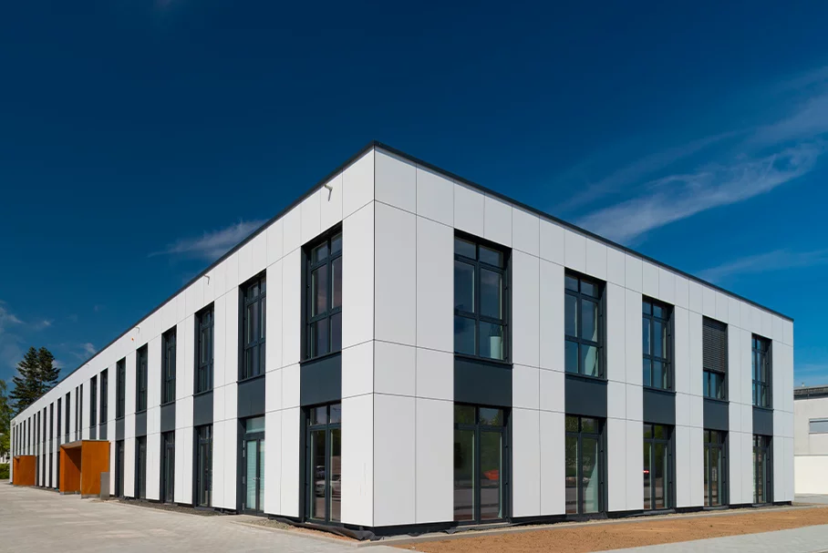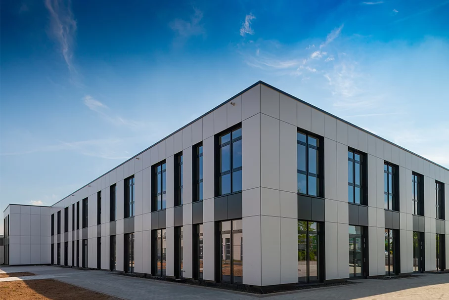 Für die Verkleidung des Gebäudes haben die Planer metallisch anmutende HPL-Fassadenplatten (High Pressure Laminate) ausgewählt. „Mit der Farbwahl und dem exakten Fugenbild gibt die Fassade dem Gebäude genau die ästhetisch zeitlose Anmutung, die wir uns wünschten“, sagt auch Thomas Weber. „Insgesamt hat das Modulgebäude eine hohe gestalterische wie bauliche Qualität. Sowohl die Module selbst, als auch die Ausbaudetails sind sehr hochwertig gefertigt“, bestätigt er.