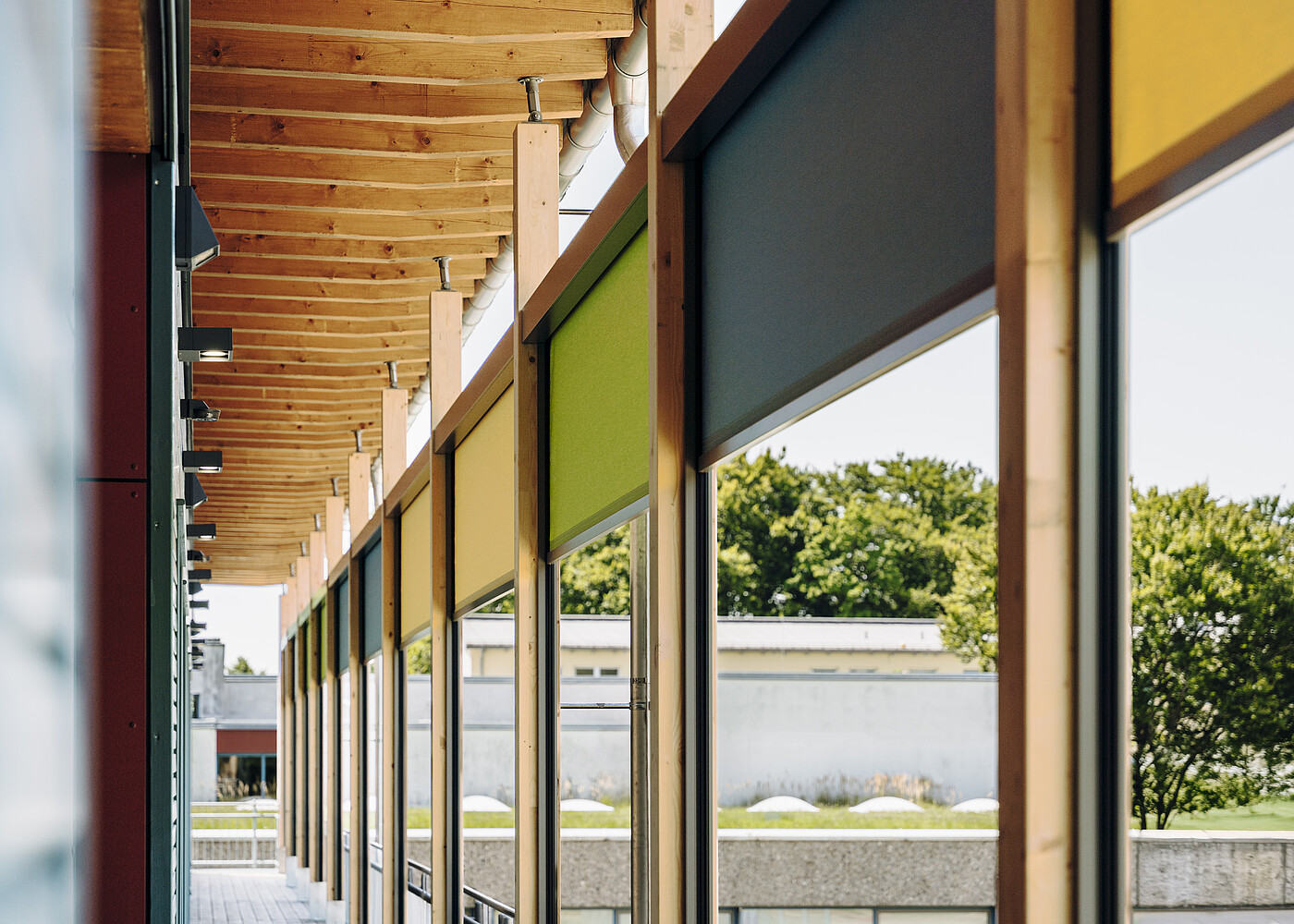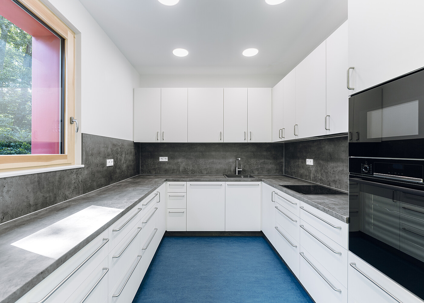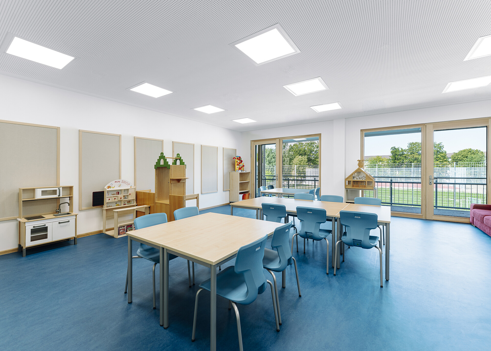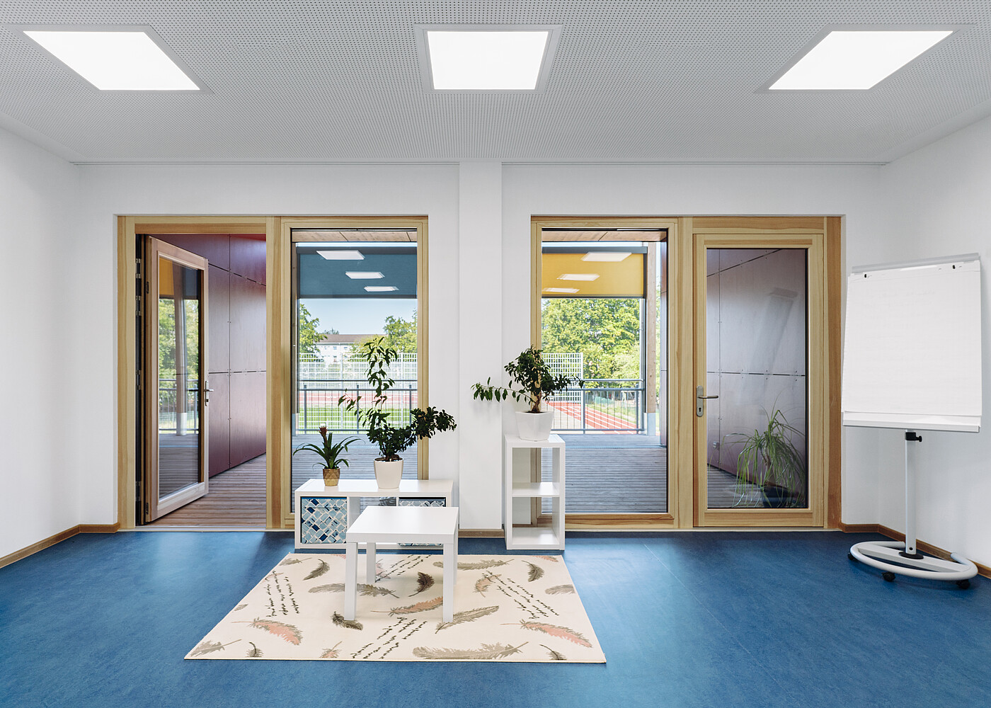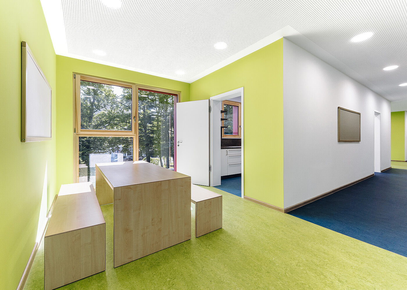 Die gesamte Dachfläche ist heute mit Photovoltaikmodulen ausgestattet und erzeugt nicht nur für den Erweiterungsbau, sondern auch für das benachbarte Schulgebäude nachhaltige Energie. Ergänzt wird die Erweiterung durch einen außenliegenden Aufzug und eine Außentreppe, die Barrierefreiheit und Sicherheit gewährleisten. Auch die Gestaltung wurde bewusst freundlich und kindgerecht gewählt: Helle Farben, große Fensterfronten und eine Öffnung zum Garten schaffen eine einladende Atmosphäre. So bietet die Grundschule inzwischen rund 170 Kindern Raum für Hausaufgabenhilfe, kreative Projekte und die Förderung sozialer Kompetenzen.