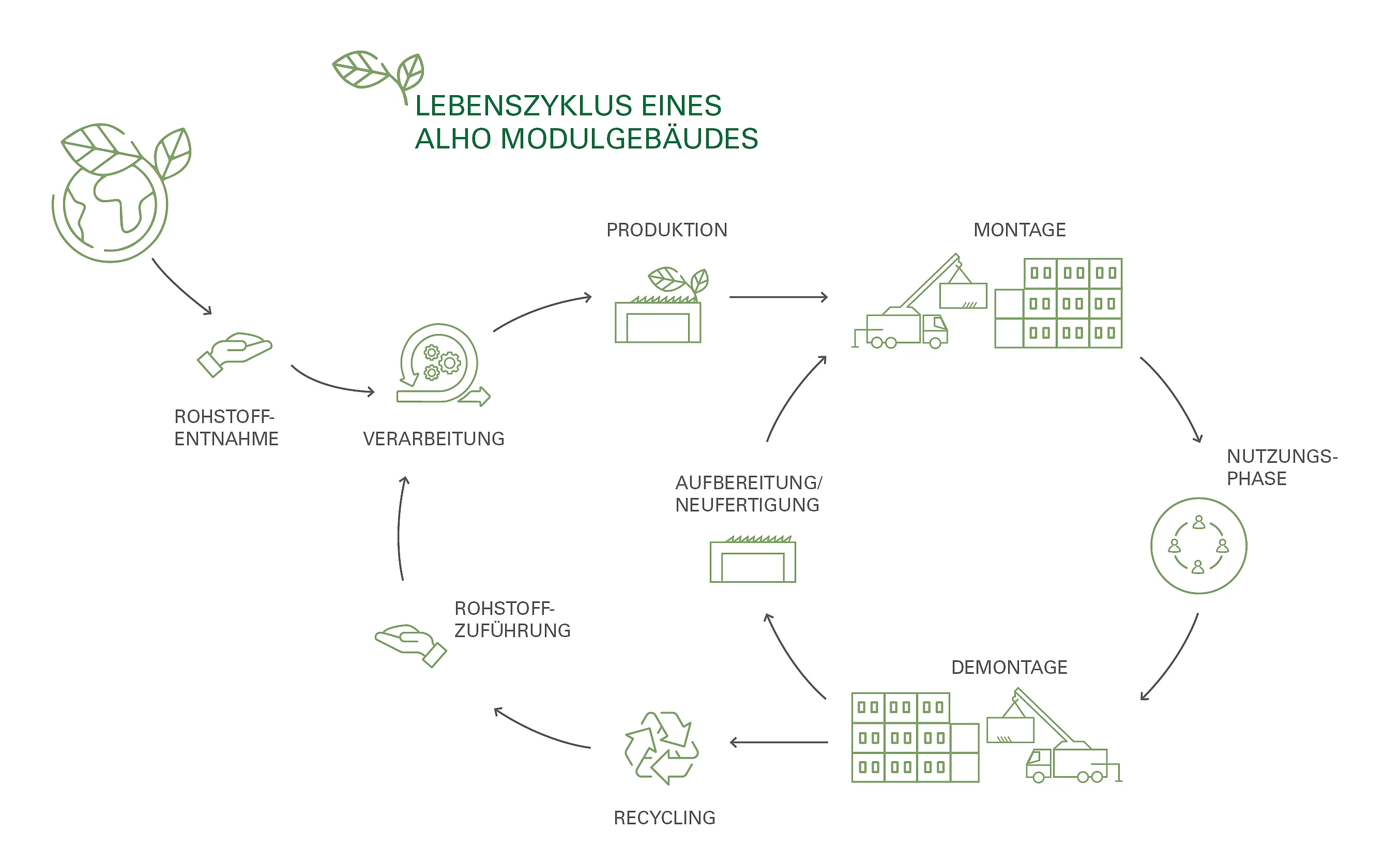 Insbesondere bei der Herstellung von für den konventionellen Massivbau notwendigen Baustoffen, wie Zement bzw. Beton, werden erhebliche Mengen an nicht erneuerbaren Ressourcen beansprucht. Neben der Rohstoffentnahme stellt auch die Produktion von Baustoffen einen erheblichen Faktor in der Umweltbilanz des Baugewerbes dar. Es wird daher in der Bauindustrie in Bezug auf Nachhaltigkeit, Ressourcenschonung und Klimaschutz zukünftig verstärkt auch darum gehen müssen, vorhandene Materialien vermehrt in Kreisläufen zu halten und möglichst oft und ohne Qualitätsverluste wiederzuverwenden.