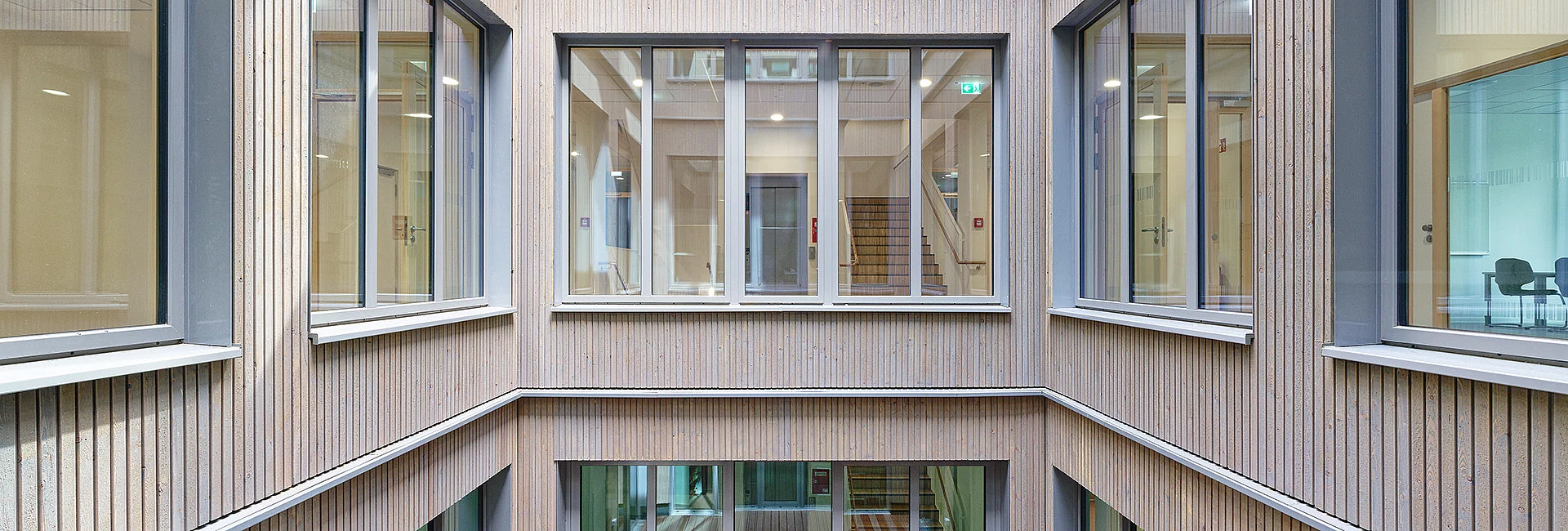 Der Modulbau bietet alle erdenklichen Freiheiten in der Auswahl der Fassadenmaterialien. Neben Putz auf WDVS lassen sich Vorhangfassaden in den unterschiedlichsten Materialien realisieren, wie z.B. in Holz, HPL oder Metall. Auch regional traditionelle Gestaltungen mit Klinker oder Naturmaterialien wie Schiefer oder Ton sind machbar. Ebenso lassen sich Pfosten-Riegel-Konstruktionen aus Metall und Glas integrieren, die beispielsweise viel Licht in Eingangsbereiche oder Treppenhäuser bringen. Zudem bietet der Modulbau die Möglichkeit, der Fassade mit Vor- und Rücksprüngen oder Auskragungen der Module zusätzlich optische Attraktivität und Spannung zu verleihen.