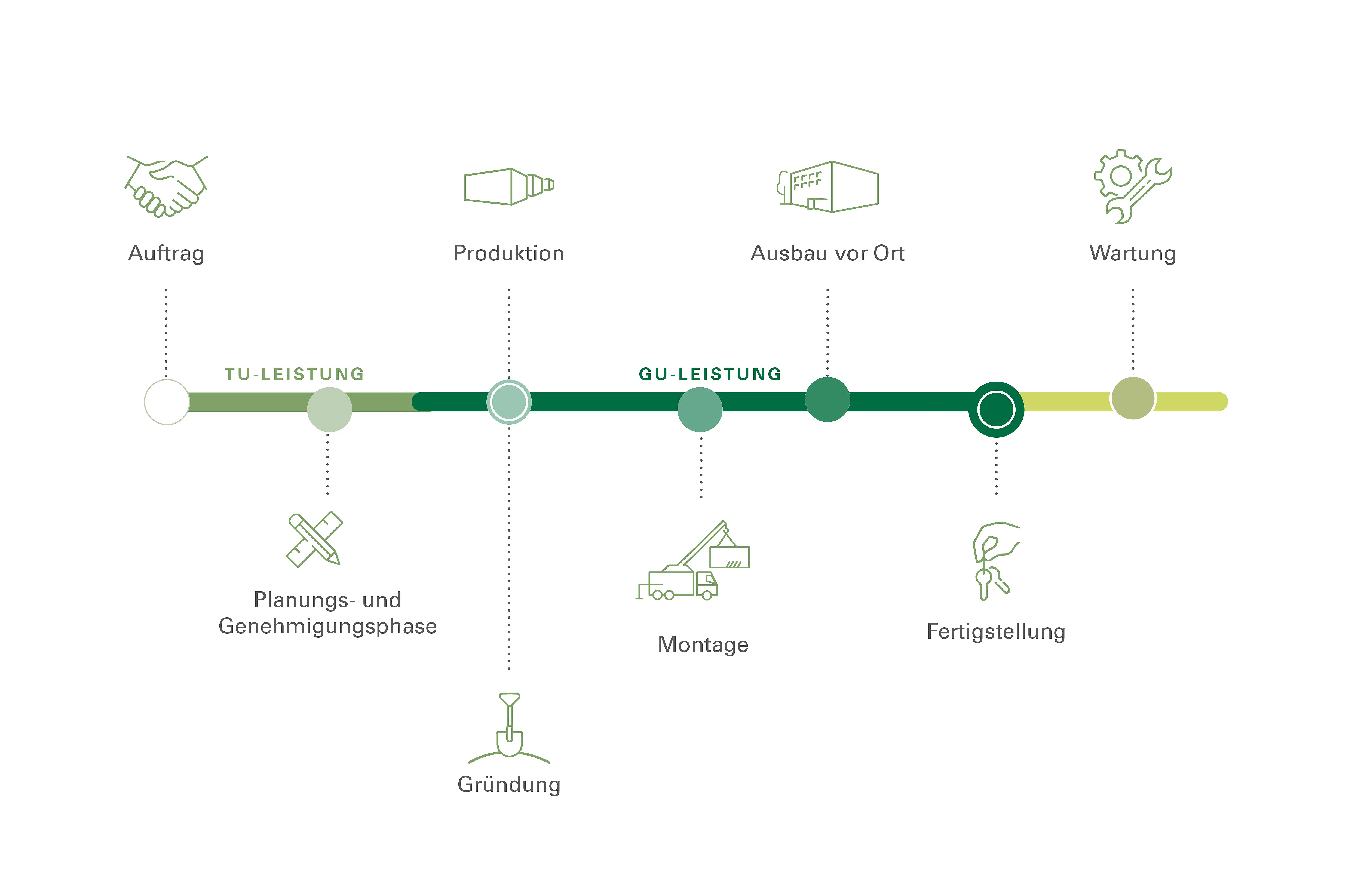 Wir binden die unterschiedlichen Gewerke just in time in unsere Fertigungsprozesse ein und organisieren sie vor Ort auf der Baustelle. Als Totalunternehmer übernehmen wir neben der Verantwortung für die Bauausführung auch die Bauplanung inklusive der Vorplanung und Genehmigungsplanung.
