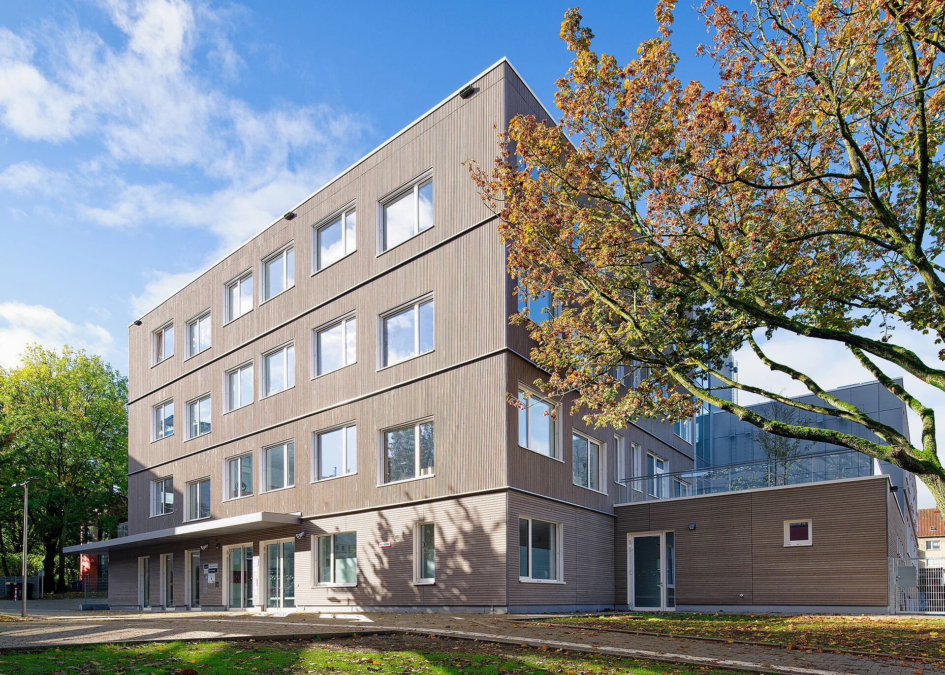Die Stadt Dortmund beauftragte ALHO mit dem Neubau als Ersatz für den nicht mehr modernisierungsfähigen Altbau. Entstanden ist ein vierzügiger Grundschulcampus mit einer Gesamtnutzfläche von rund 5.582 Quadratmetern, der den höchsten Anforderungen an moderne, nachhaltige Bauweise und pädagogische Funktionalität gerecht wird. Das Gebäude besteht aus insgesamt 144 Modulen, die in einer Bauzeit von 60 Wochen errichtet wurden, und beeindruckt durch seine hybride Bauweise sowie seine innovative Vorhangfassade mit Lärchenholzschalung und begrünten Teilbereichen. 60 Wochen Bauzeit vor Ort, Fertigstellung im Sommer 2023.