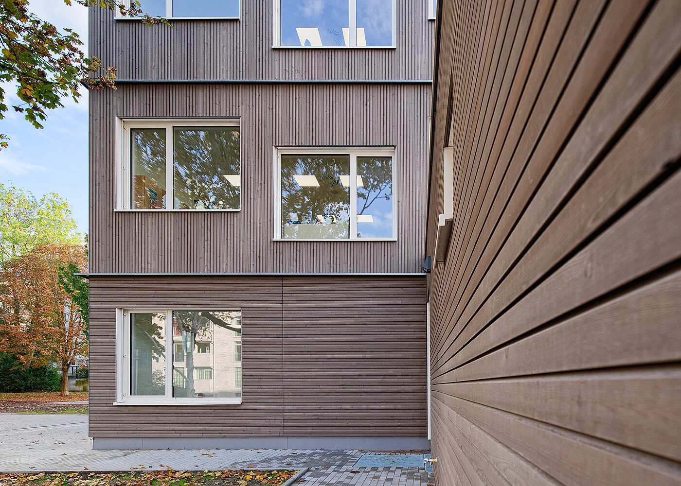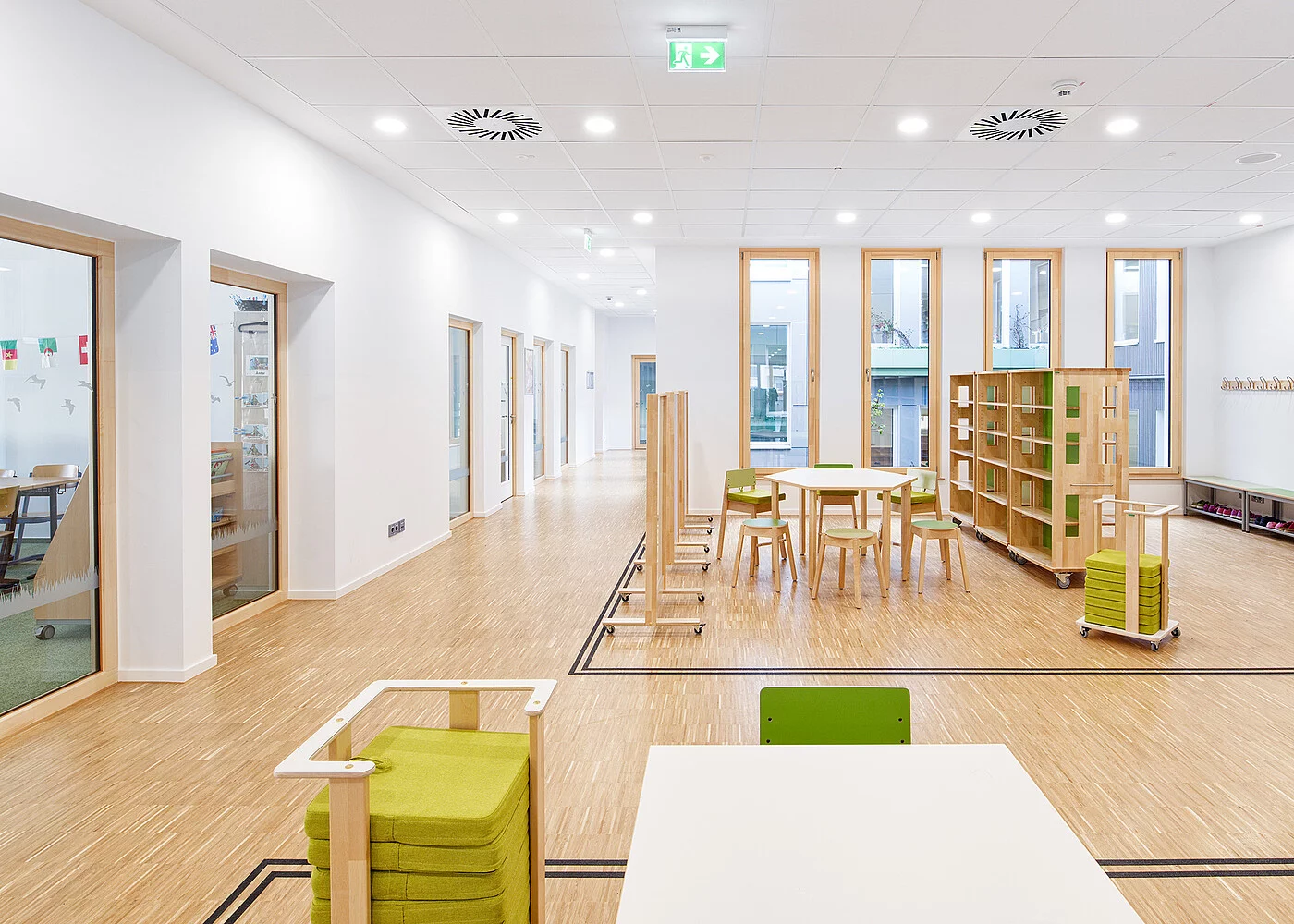 In Zusammenarbeit mit dem Architekturbüro futur.drei Planer GmbH wurde ein Konzept entwickelt, das durch lichtdurchflutete Räume, großzügige Verglasungen und die Verwendung natürlicher Materialien wie Holz-Aluminium-Fenstern ein angenehmes Ambiente schafft.