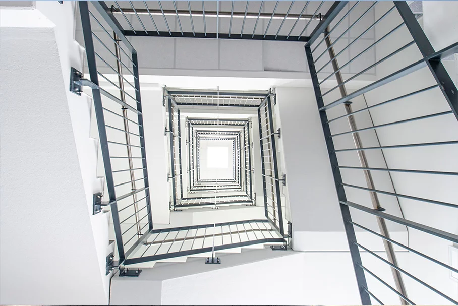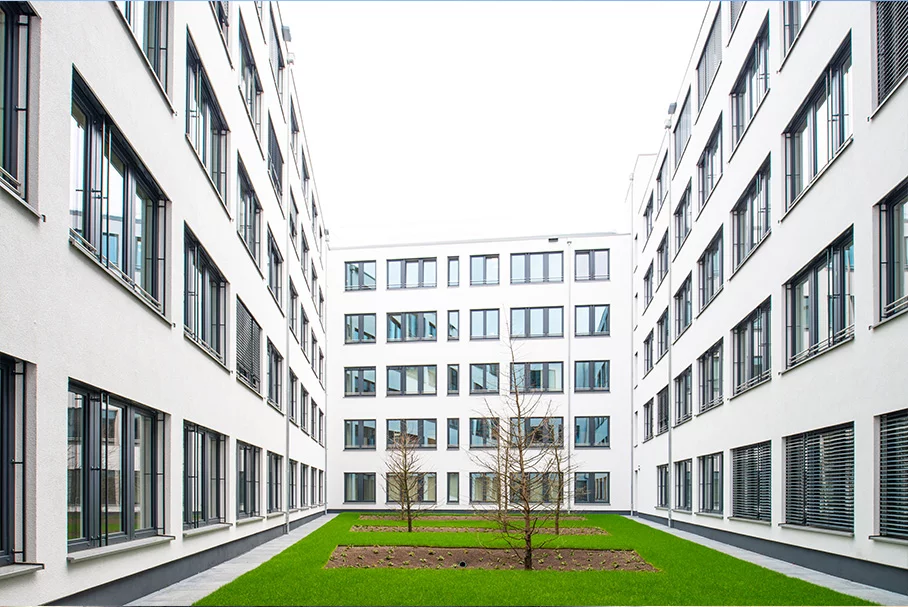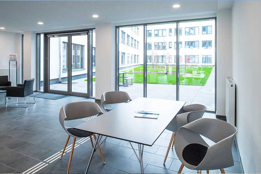 Unter der Leitung des Architekten Olaf Peters wurde der zunächst systemunabhängige Entwurf für das 9.600 qm umfassende Bürogebäude dem ALHO Modulbauraster angepasst. „Im Sinne einer großzügigen Raumwirkung haben wir sehr darauf geachtet, nur wenige Stützen im Innenbereich zu zeigen“, berichtet Architekt Peters. Im Erdgeschoss beeindruckt das über 100 qm große Foyer: Über eine großflächige Pfosten-Riegel-Glasfassade leitet es visuell direkt in den grünen Innenhof über. Auch im 4. OG befindet sich ein 113 qm großer, ebenfalls stützenfrei konstruierter Saal für repräsentative Meetings.