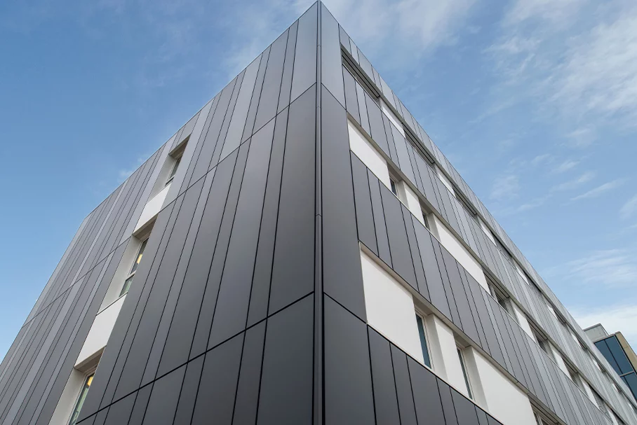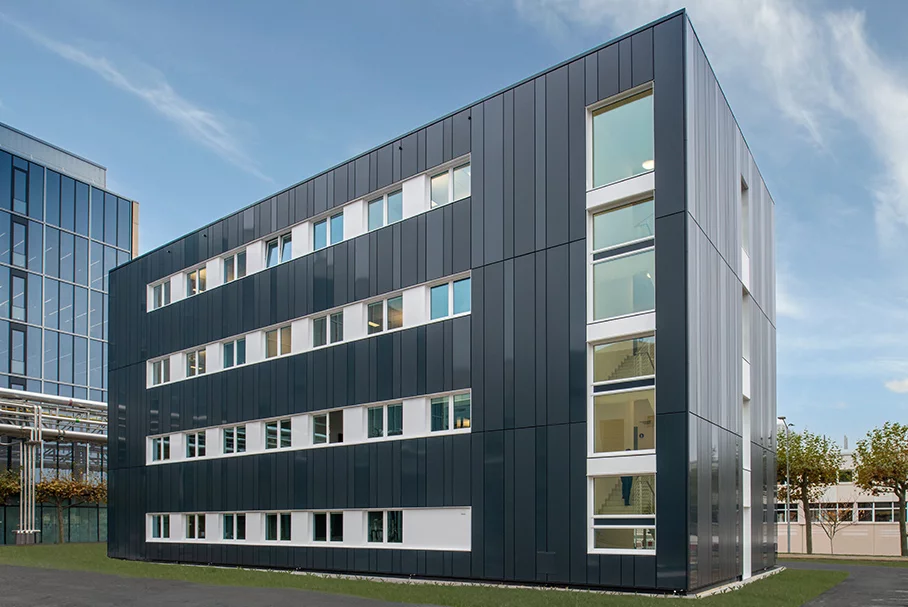 Ein hochmodernes Konvektorensystem überträgt sowohl Wärme als auch Kälte in die Räume – aber nicht wie meist üblich über die Decken, sondern über die Wände. Hierfür entwickelte ALHO besondere Einbaulösungen bzw. Verkleidungen, welche die Technik vor Beschädigung schützen. Eine Vorgabe beim Bauen mit Merck ist auch die Ausführung einer nicht brennbaren Fassadenverkleidung. Die Planer entschieden sich darum für eine hinterlüftete Vorhangfassade aus glatten, unterschiedlich breiten Aluminiumkassetten in edlen, dunklen Anthrazit-Tönen. Das Wärmedämmgefälledach wurde als Gründach ausgebildet und bietet so einen ökologischen Ausgleich zu der durch die Bebauung versiegelten Bodenfläche. Und sollte in Zukunft der Platzbedarf steigen, ist das Gebäude auch dafür heute schon gerüstet: An einer der Stirnseiten des Riegels, gleich neben Haupteingang, Foyer und Treppenhaus ist eine Spiegelung des Baukörpers problemlos möglich – alle Anschlüsse dafür hat ALHO bereits vorbereitet.