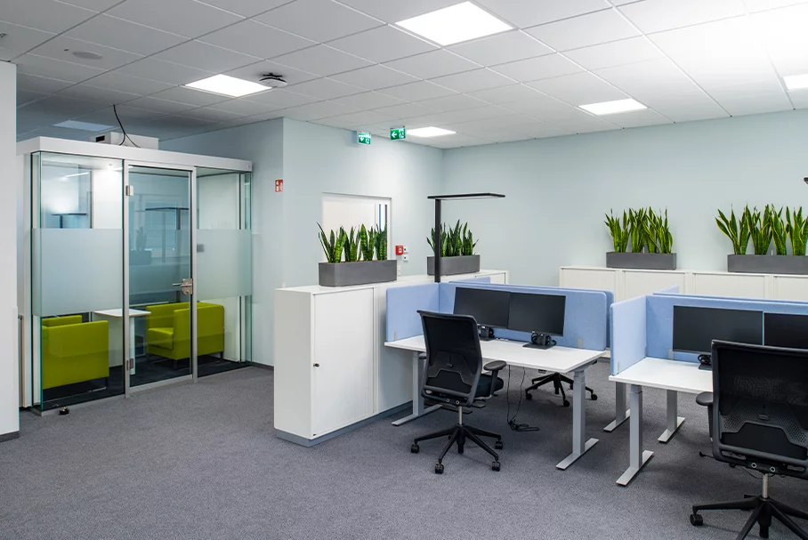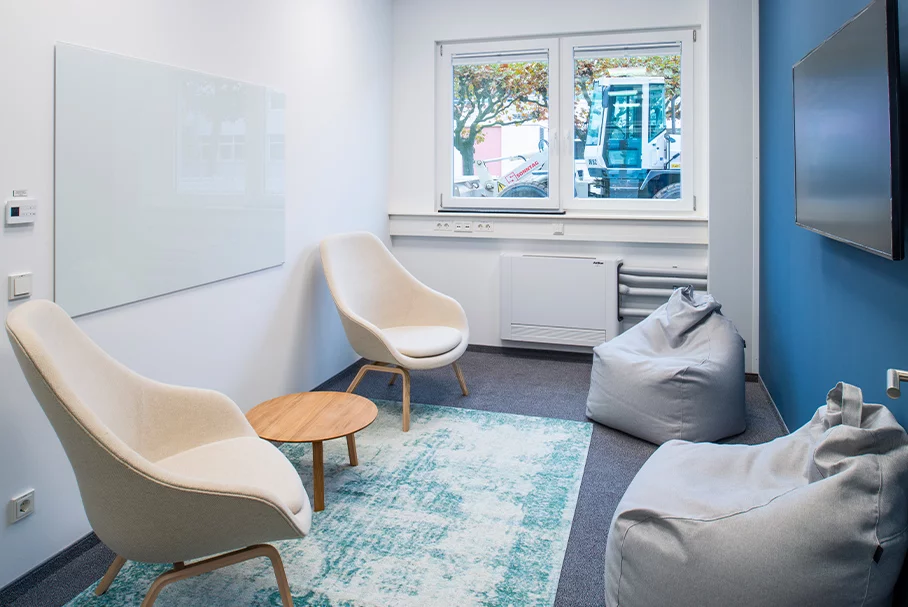 In einer Bauzeit von nur 16 Wochen vor Ort konnte der Büroneubau für rund 80 Mitarbeiter schnell und qualitativ hochwertig umgesetzt werden. Alle vier Büroetagen mit einer Bruttogeschossfläche von jeweils rund 400 Quadratmetern sind als Open Spaces organisiert, auf denen unterschiedliche Arbeitslandschaften angeordnet werden können. Merck pflegt im Unternehmen ein sehr transparentes Arbeiten und kommunikatives Miteinander. Darum sind Abgrenzungen innerhalb der Fläche – wie beispielsweise bei integrierten Konferenz- und Besprechungsräumen – mit gläsernen Trennwänden ausgeführt. Im Erdgeschoss gibt es eine mobile Trennwand im Besprechungsraum, die besonders schnell unterschiedliche Raumbelegungen möglich macht. Mit Glas, Holz und hochwertigen Bodenbelägen ist die Materialwahl zeitlos, hell und edel.