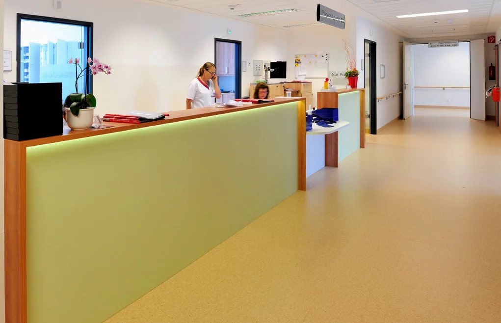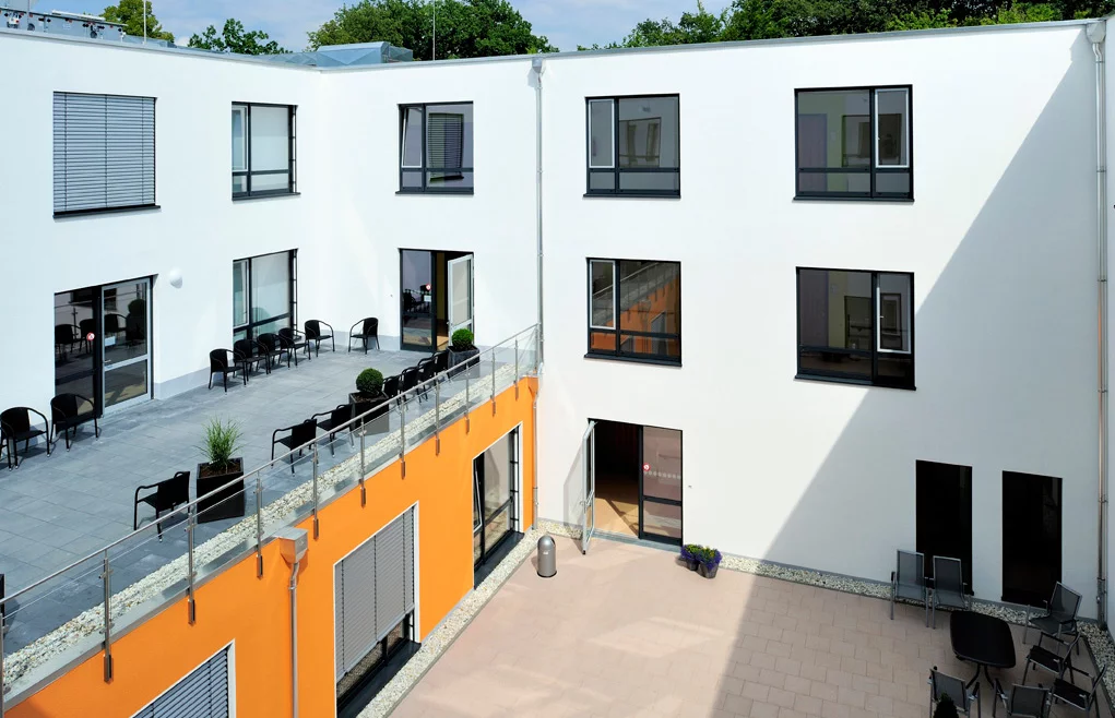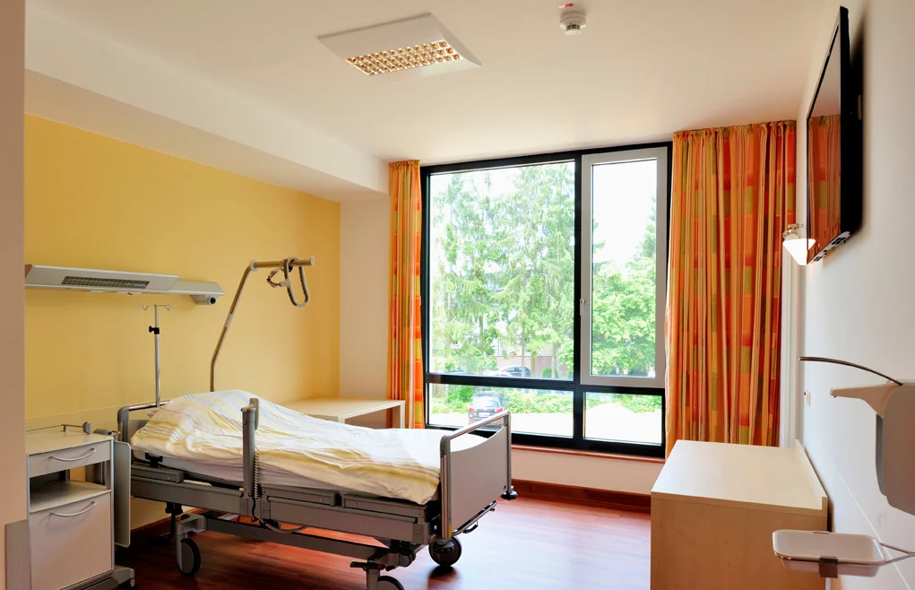 Und beim ersten Projekt – dem Neubau der Geriatrie 2012 – spielte der Faktor Zeit die entscheidende Rolle. „Unser Standort Hardterwald-Klinik wurde im Oktober 2011 verkauft. Aufgrund der vertraglich vereinbarten Fristen bis zur besenreinen Übergabe des Gebäudes hatten wir einen großen Zeitdruck – innerhalb von sechs Monaten musste das neue Bauprojekt abgeschlossen sein. Als einzige praktikable Lösung hat sich hier die Modulbauweise herausgestellt. Konventionelles Bauen hätte viel zu lange gedauert. Entscheidend für die Zusammenarbeit mit der Firma ALHO war in erster Linie, dass sie Erfahrung mit solchen Bauwerken hatte. Und alles hat perfekt geklappt“, beschreibt Imdahl sein erstes Projekt mit ALHO. 44 großzügige Patientenzimmer sind so entstanden, die mit jeweils 30 m² ausreichend Platz für die älteren Patienten bieten. In der Tagesklinik der neuen Geriatrie können zeitgleich 15 ältere Patienten untergebracht werden. Der neue Modulbau ist selbstverständlich rollstuhlgerecht angelegt. Insgesamt arbeiten hier ca. 100 Fachkräfte, darunter Ärzte, Ergotherapeuten, Krankengymnasten, Masseure, Logopäden und Sozialarbeiterinnen. Für eine besonders angenehme Atmosphäre sorgt ein ausgefeiltes Innenraumkonzept. Warme Farbtöne, strahlend helles Licht und viel Platz auch in den Therapieräumen und Gängen sollen den Patienten den Aufenthalt in der Geriatrie besonders angenehm machen.