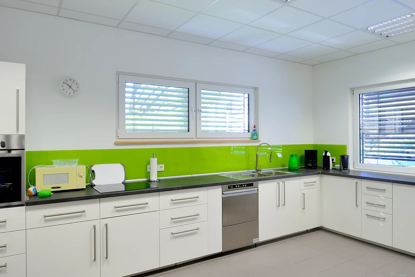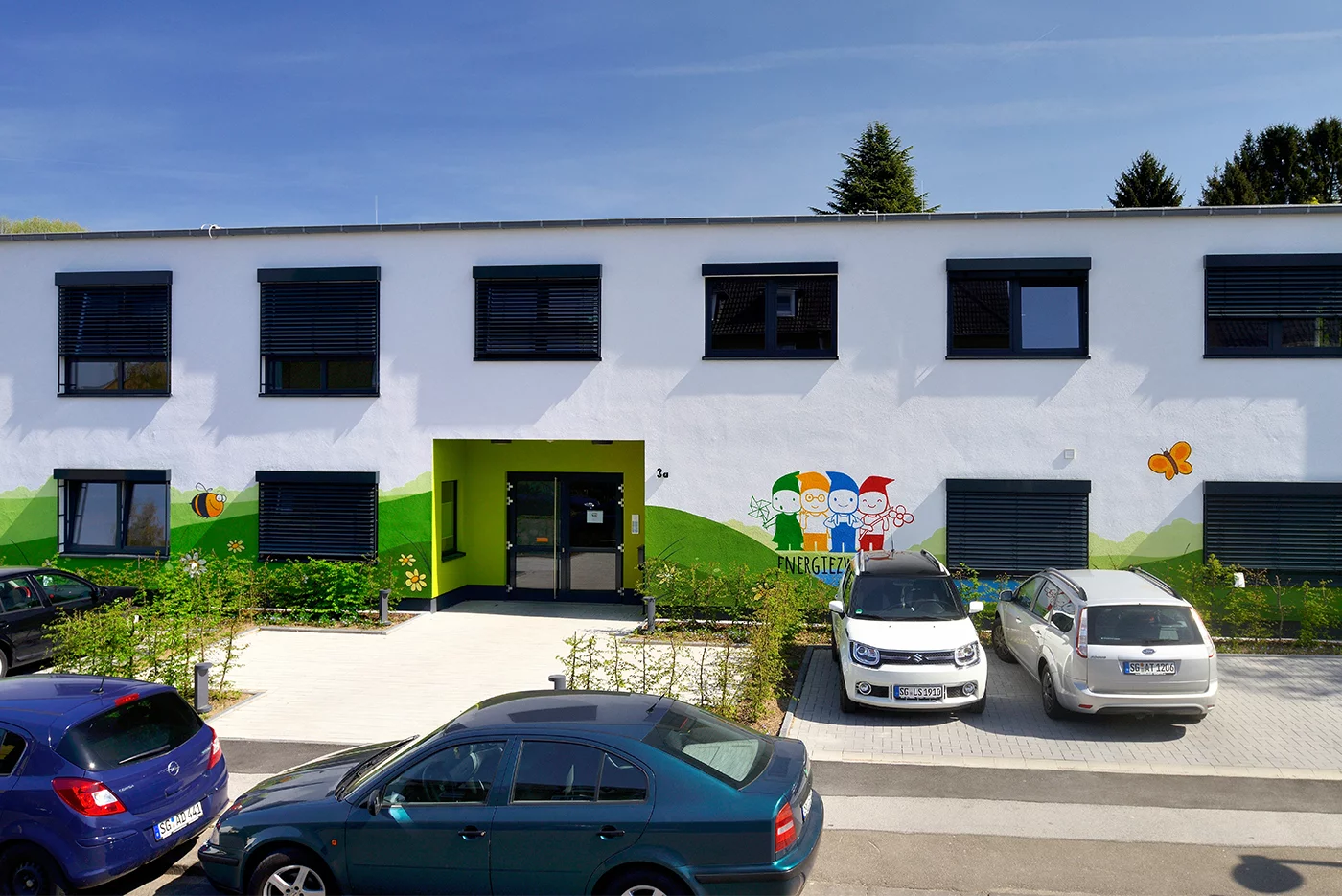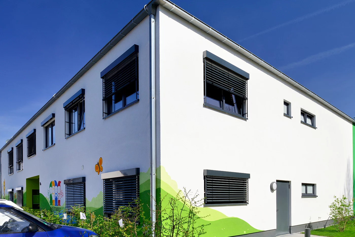 Vorgezogene Dach- und Wandscheiben bieten zur Gartenseite hin nicht nur guten Witterungsschutz, sondern sorgen als starre „Brises Soleils“ gleichzeitig für eine angenehme Verschattung der Räume im Sommer, sodass sie trotz ihrer großen Fenster nicht übermäßig aufheizen. Die weiße Putzfassade erhielt Akzente in zwei Grüntönen, die aus dem CI der Stadtwerke Solingen stammen. Zusätzlich wurde das Graffiti einer Landschaft aufgebracht, in dem sich bunte Zwerge tummeln. Überhaupt identifizieren sich die Stadtwerke sehr mit „ihrer Kita“: Rund 100 Mitarbeiter nahmen begeistert an einem Voting teil, bei dem ein treffender Name für die neue Einrichtung gesucht wurde. „Energiezwerge“ kam dabei heraus.