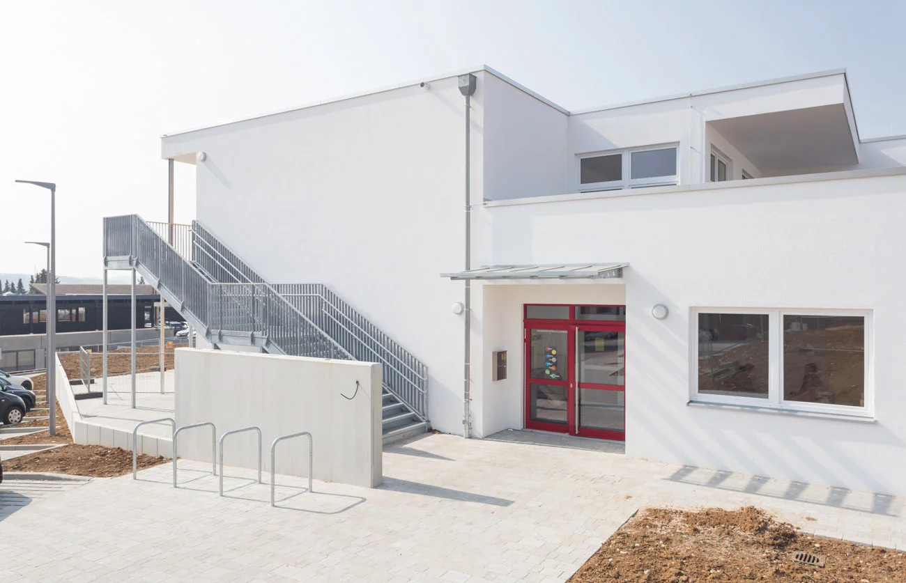 Die Gruppenräume sind auf der Südseite des Hauses angeordnet und werden über große Fensterflächen üppig mit Tageslicht versorgt. Die Fassade aus weißen Putzflächen und holzverkleideten Bereichen ist abwechslungsreich gestaltet und das extensiv begrünte Flachdach sorgt für ein gesundes Mikroklima.