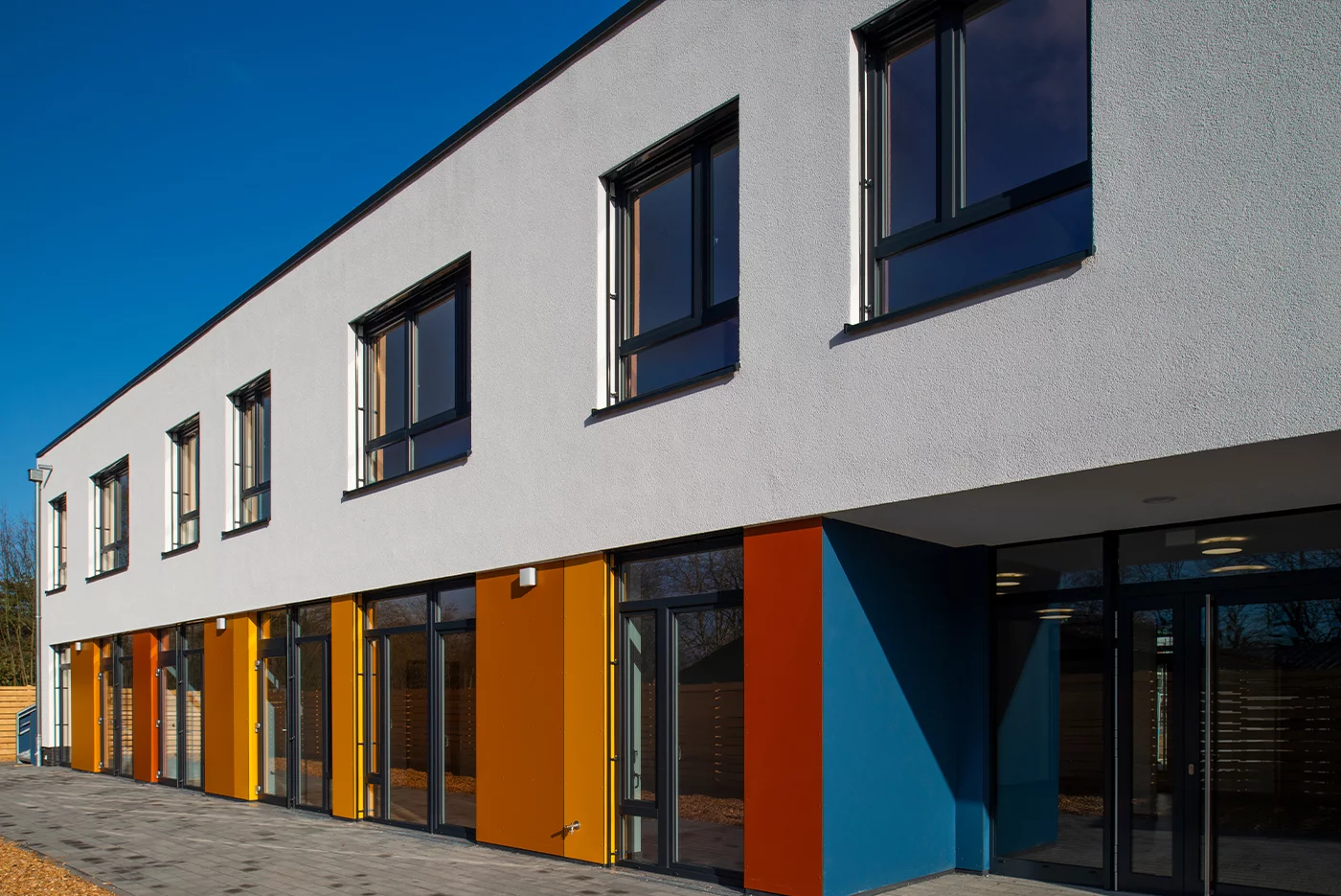 Die denkmalgeschützte Lutherkirche am Gabelsberger Platz gibt die Farbgebung und die Materialien für die äußere Gestaltung der Neubauten und somit auch des Kindergartens vor. Der Eingangsbereich der Kindertagesstätte wurde daher mit Trespa-Fassadenplatten in Silbergrau und Mittelgrau gestaltet. Graue Klinkerriemchen akzentuieren das Treppenhaus und nehmen Bezug auf die keramische Oberfläche der Kirchenfassade. Zum Innenhof des Ensembles hin herrschen dagegen warme Ocker- und Rottöne vor.