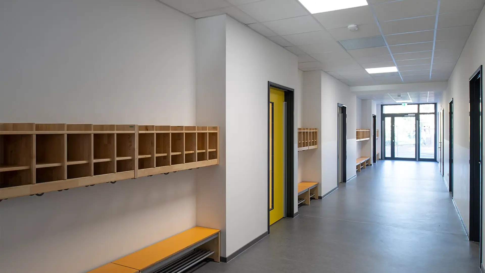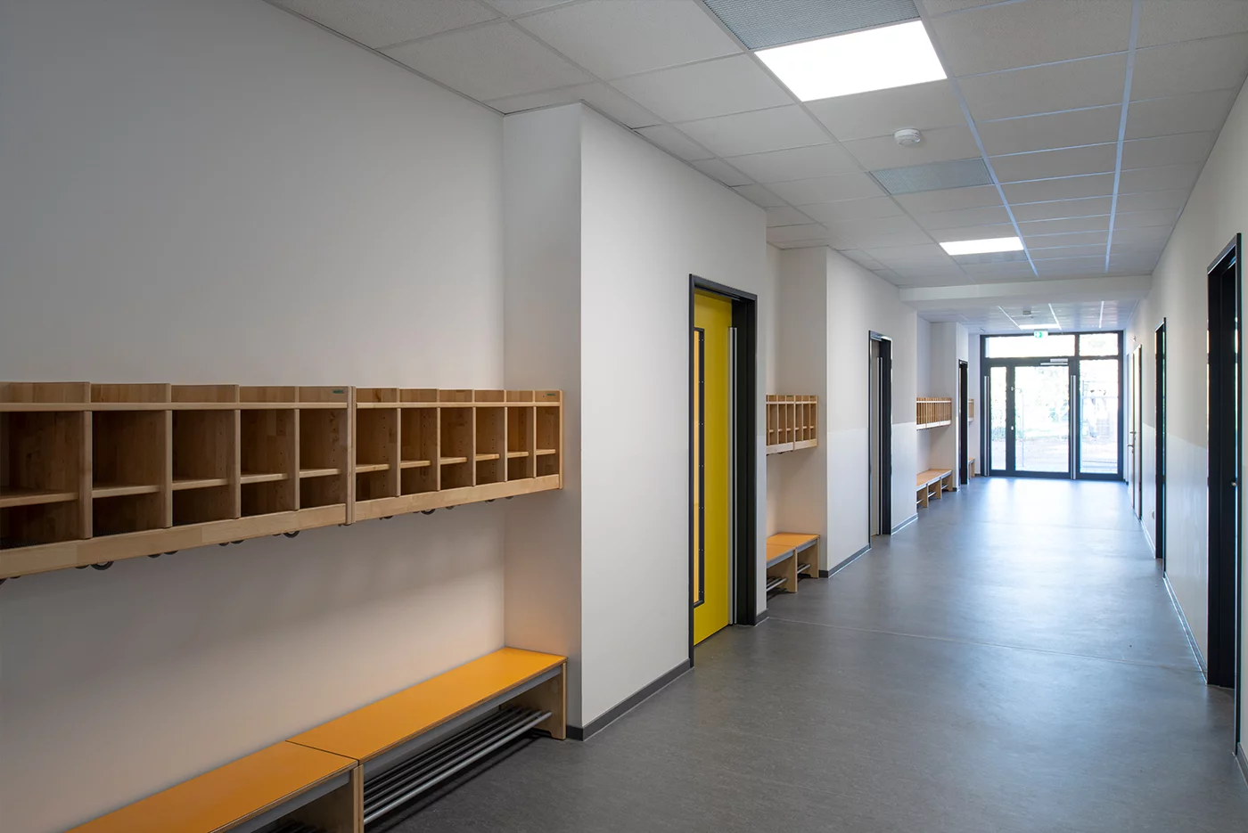 Auf einer Fläche von 1.027 qm bietet die Kita Platz für insgesamt 5 Gruppen. Jede Gruppe besitzt einen eigenen Materialraum. Eine Werkstatt, Intensivräume, ein Schlafraum, ein Mehrzweckraum - unter anderem zum Turnen -, Sanitärräume und eine Aufwärmküche mit Bistrobereich ermöglichen es, für die Kinder einen abwechslungsreichen und zugleich gut strukturierten Tagesablauf zu gestalten. Ergänzt wird das Raumprogramm durch Aufenthaltsräume für das Personal und die Leitung sowie ein Elternsprechzimmer. Die Räume sind für die optimale Orientierung der Kinder innerhalb des Gebäudes farblich gekennzeichnet: Während die Gruppenräume gelb, orange, rot, grün und blau gekennzeichnet sind, bekamen die Räume für die Betreuer eine pinkfarbene Markierung.
