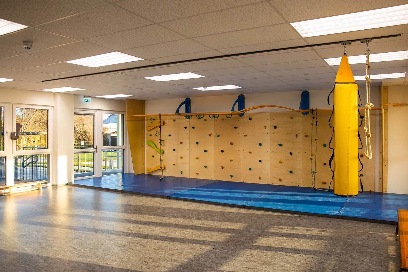 Im Erdgeschoss sind drei Gruppenräume für die Krippenkinder mit Schlafmöglichkeiten und Sanitäreinrichtungen angesiedelt – außerdem die Küche mit dem Speiseraum und – jenseits des Foyers mit Haupteingang und Treppenhaus – die Leitungsbüros sowie weitere Verwaltungs- und Technikräume. Den Abschluss bildet mit direktem Zugang nach draußen ein über 80 Quadratmeter großer, stützenfreier Mehrzweckraum. Dieser steht den Kindern nicht nur als Indoor-Bewegungsraum zur Verfügung, sondern soll auch eifrig für Feste genutzt werden.